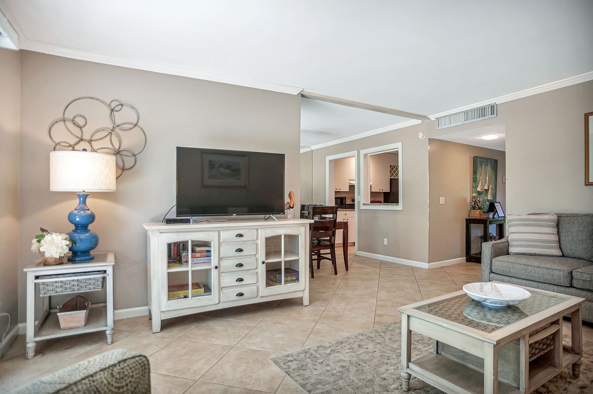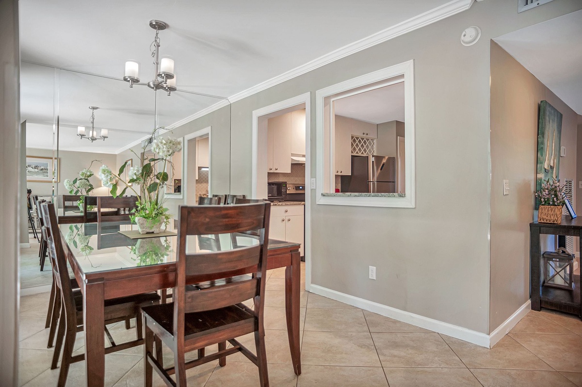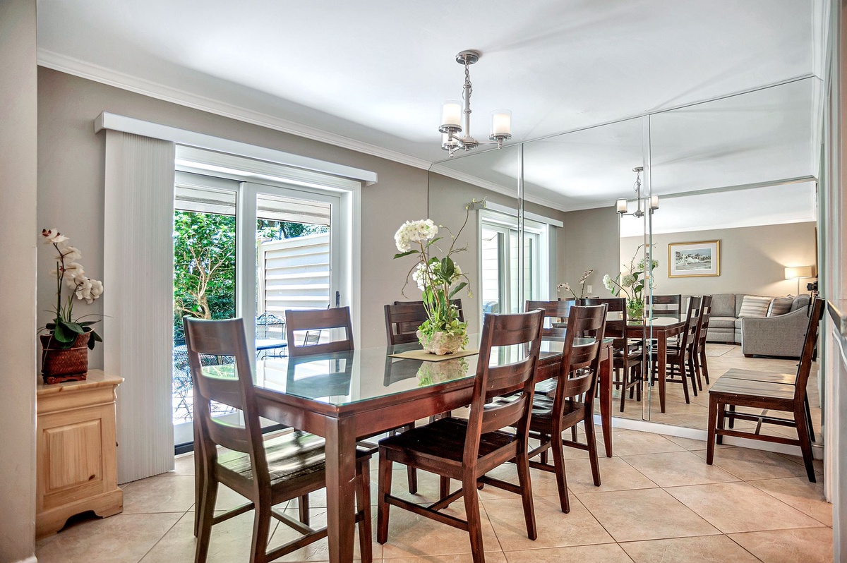 The living room enjoys views of the golf course with a sofa, matching loveseat, two swivel chairs and a large flat screen TV. Sliding glass doors access the oak-shaded patio and outdoor table, from both the living room and the dining room. Seating eight at its generously sized table is the dining room.