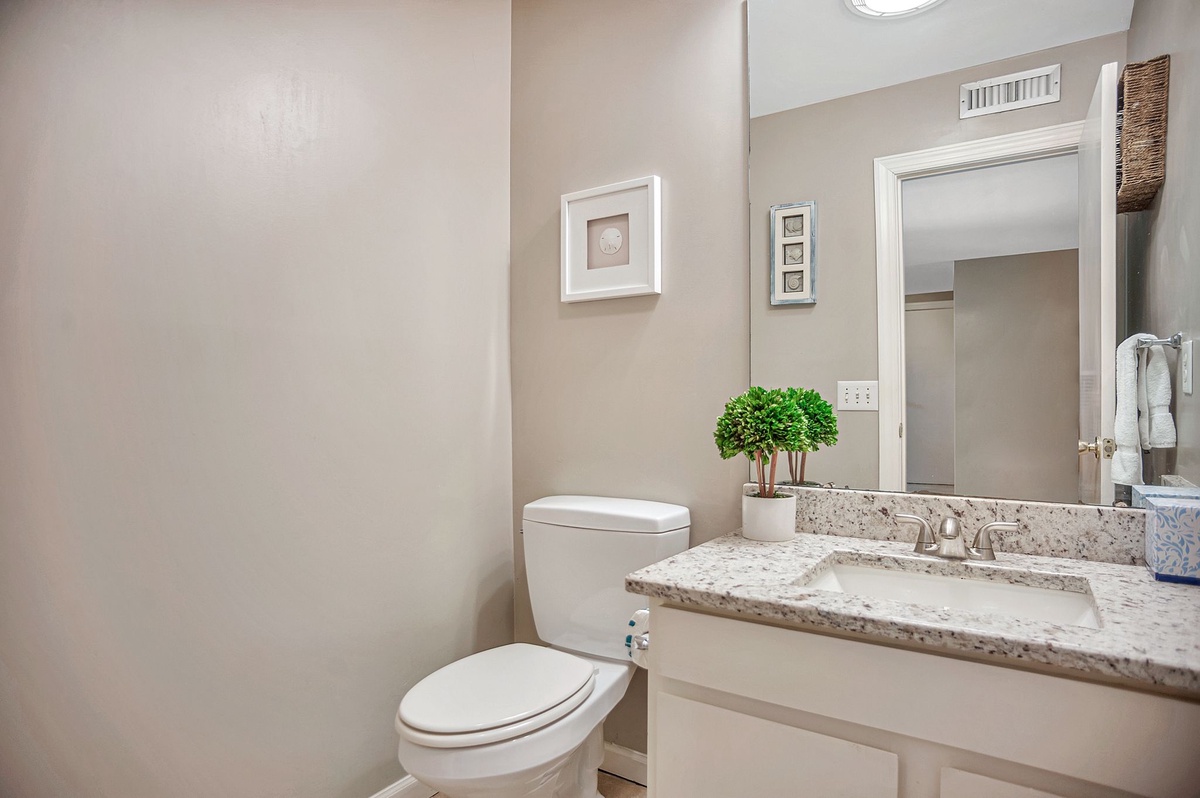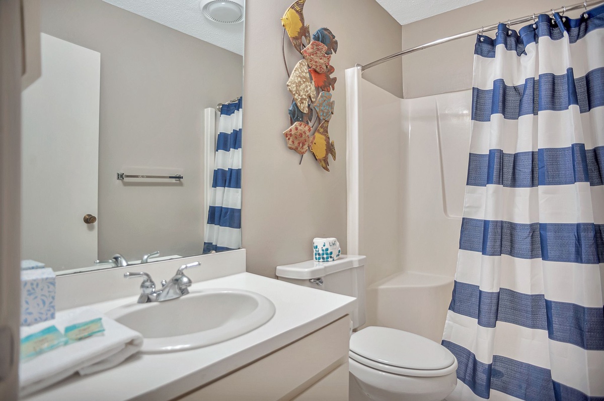 Viewing the golf and oaks, the second floor master bedroom features a swing king-sized (two twin beds upon request) and private bathroom with spacious vanity and a tub/shower combination. Across the hall is another bedroom, housing two queen beds with beach motif furnishings and its own private bathroom with walk-in shower.