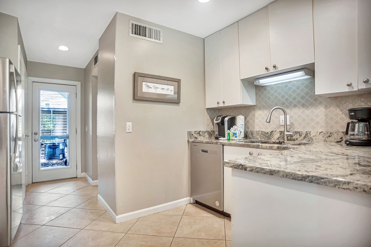 With crisp white cabinetry, the kitchen features every major appliance including a flat cook-top and nearby washer and dryer.