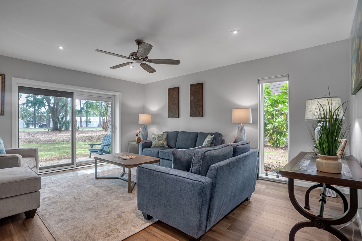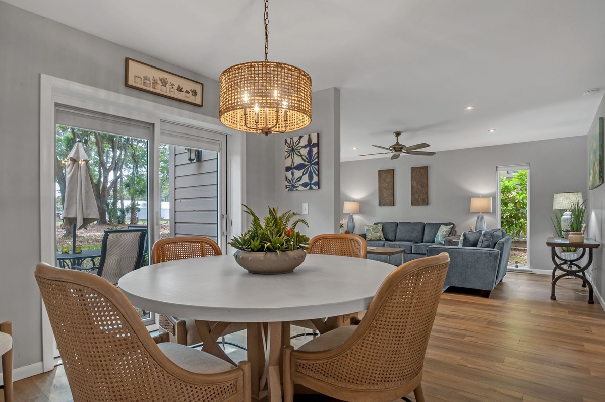 Set along the first fairway at Harbour Town Golf Links, this PET FRIENDLY villa presents the ultimate Sea Pines experience for you and your four-legged friend. Those views out to the course are beautifully framed by dual sets of sliders in the living and dining rooms, each leading out to a sun-dappled patio offering al fresco dining beneath a wide umbrella.
