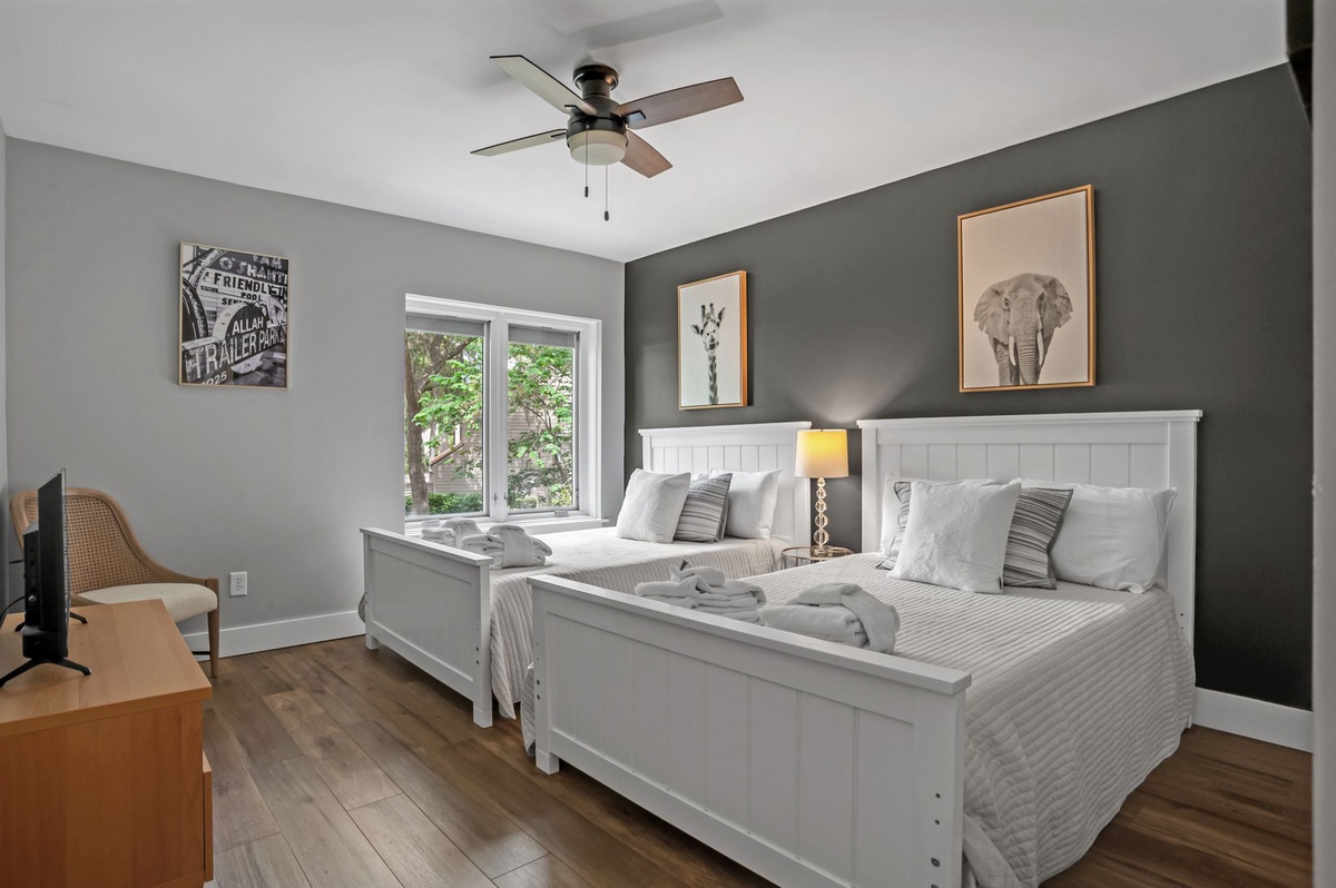 Each of the villa’s two suites indulges with comfort and lush natural light. In one suite, a king-size bed gazes out toward the first fairway, with a flat-screen TV at its foot and a ceiling fan above. Its private suite enjoys a wide vanity as well as a walk-in closet. The second suite pairs two double beds with a flat-screen TV, ceiling fan and en suite bath with walk-in shower.