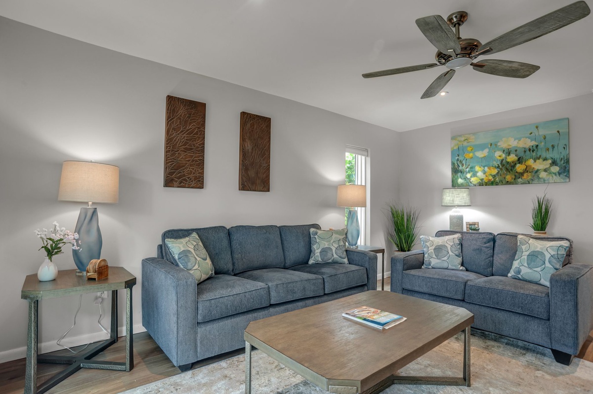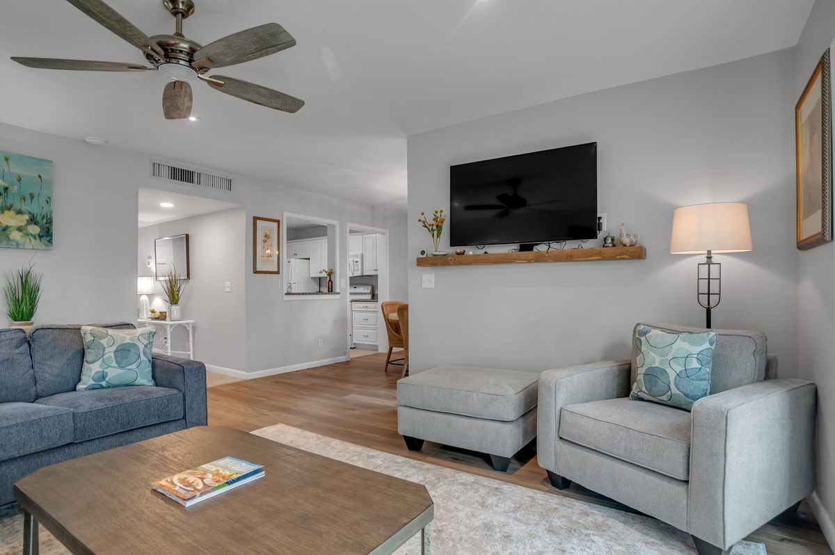 This scenery infuses the combined space with light, from the deep cerulean of the sleeper sofa and loveseat facing a flat-screen TV in the living room to the coastal rattan seating for six around the dining room table.