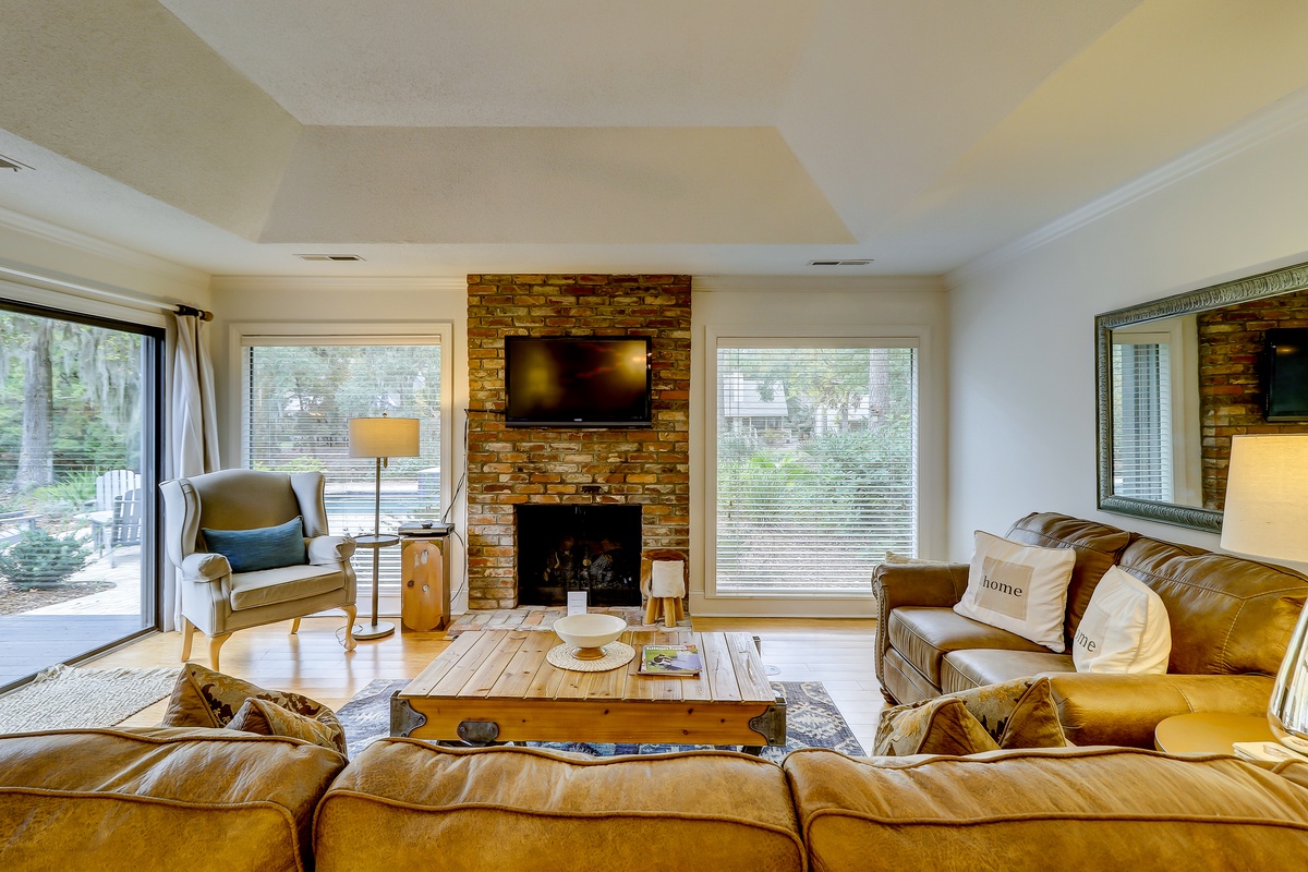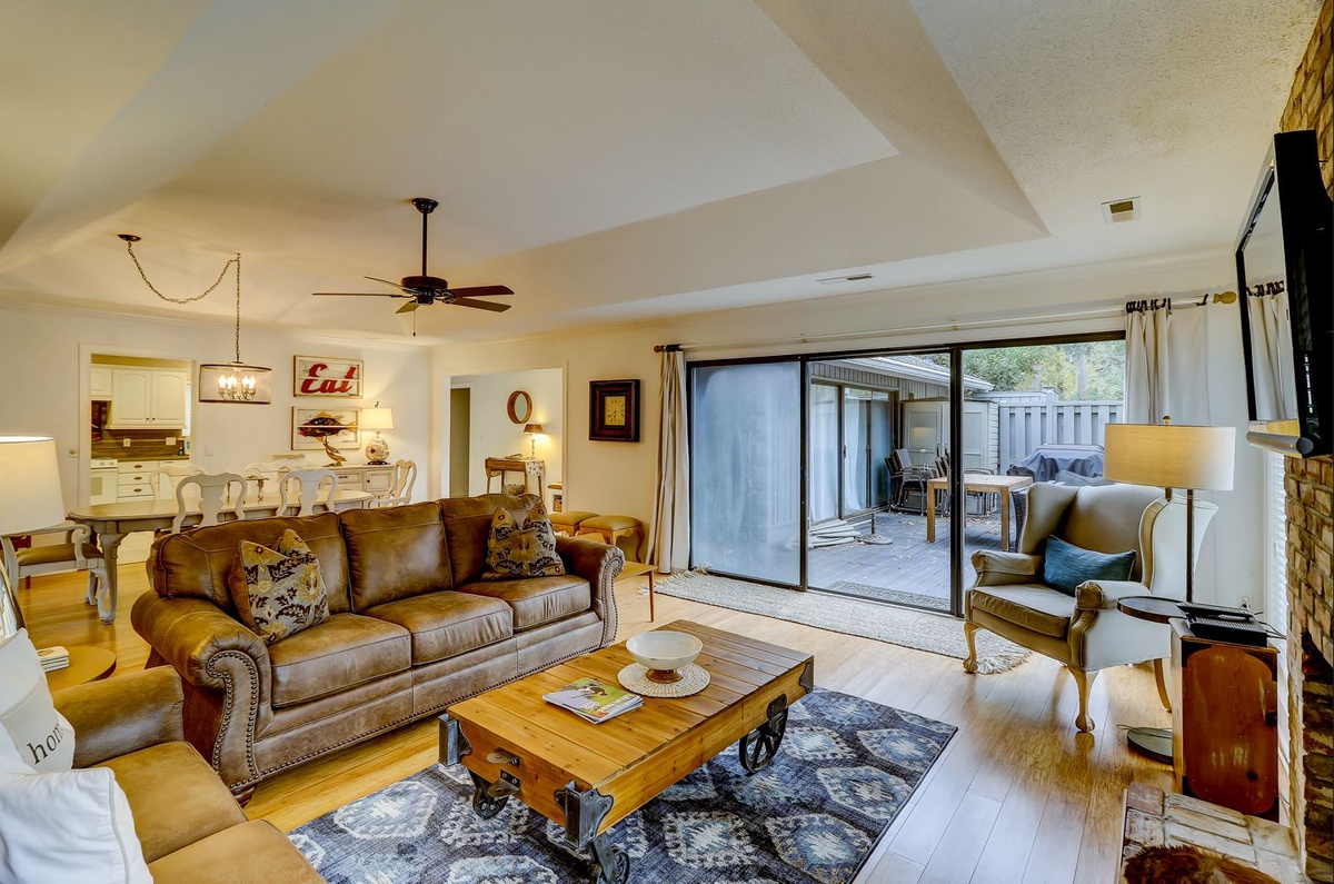 Beside the kitchen, is an open-concept living room and dining room, accented with vaulted ceilings allowing natural light. A shabby chic dining table can host eight. The living room features overstuffed leather seating surrounding a brick fireplace and flat-screen TV.