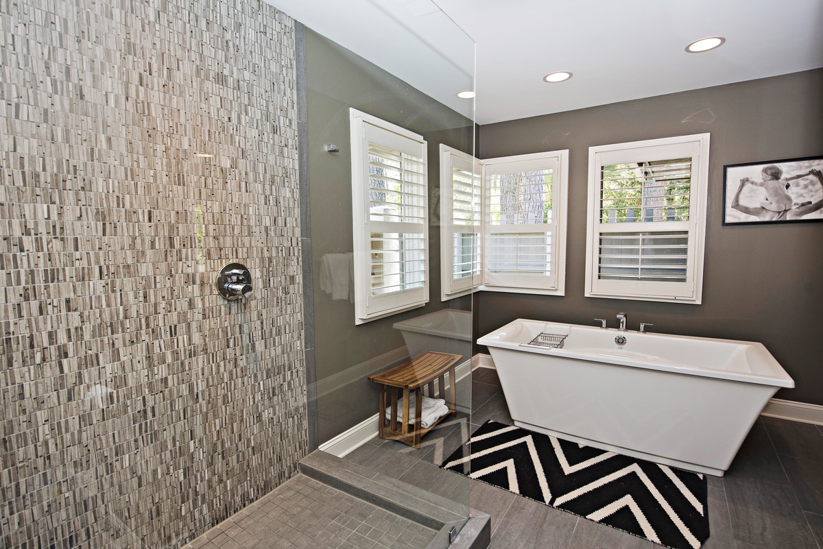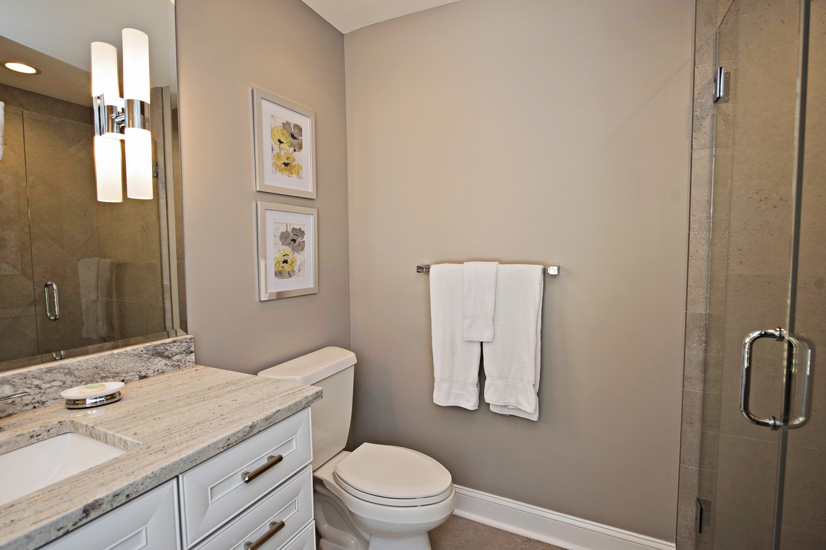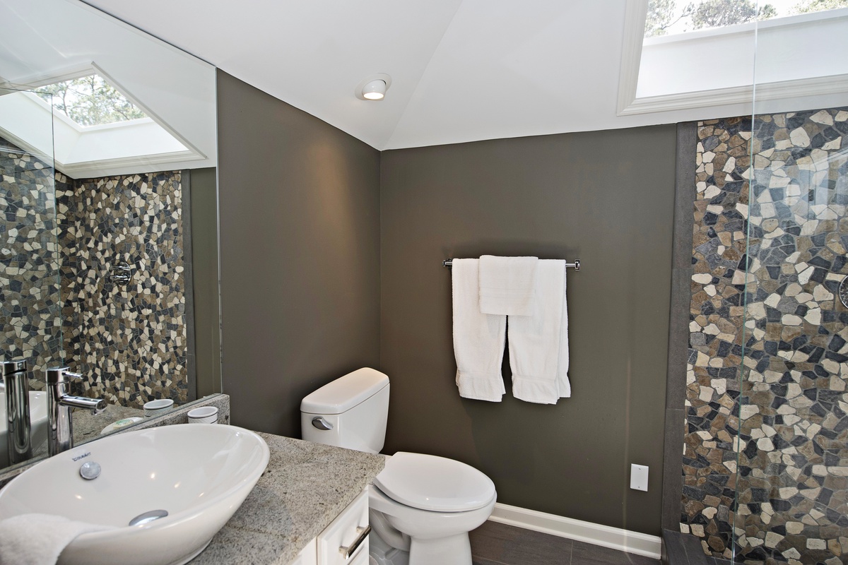A half level down features a cozy den with flat screen TV, DVD/DVR, sofa and access to the wraparound deck and heatable pool. A half level up from the main floor is an incredibly spacious bedroom in white and slate-blue with a king-sized bed, flat screen TV, DVD, ceiling fan, bay window with bench seating and a private bath with a shower.