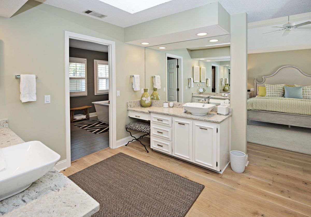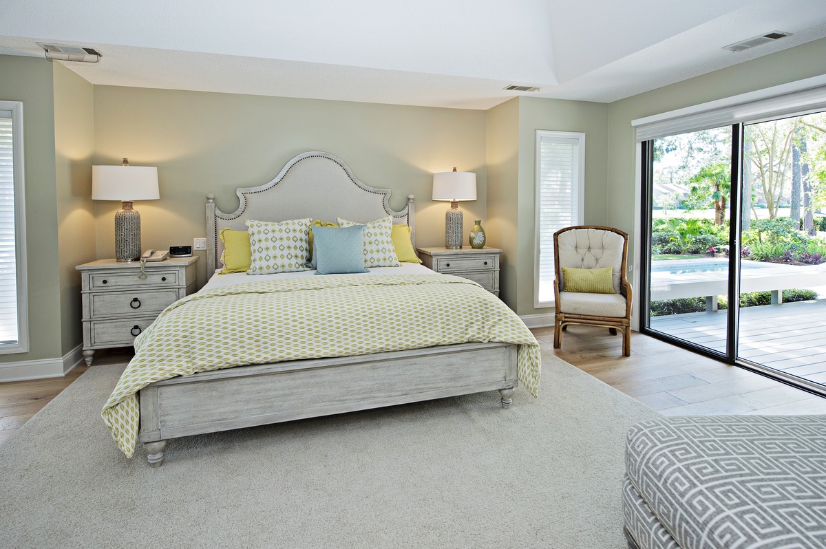 The newly refurbished master suite in soft green, yellow and cream features a lovely four poster king-sized bed, sliding glass doors to the pool and golf view, flat screen TV and private bath. The bathroom’s amenities include a stand alone tub, surrounded by plantation shuttered windows, a walk-in tiled shower, two separate vanities and walk-in closet.