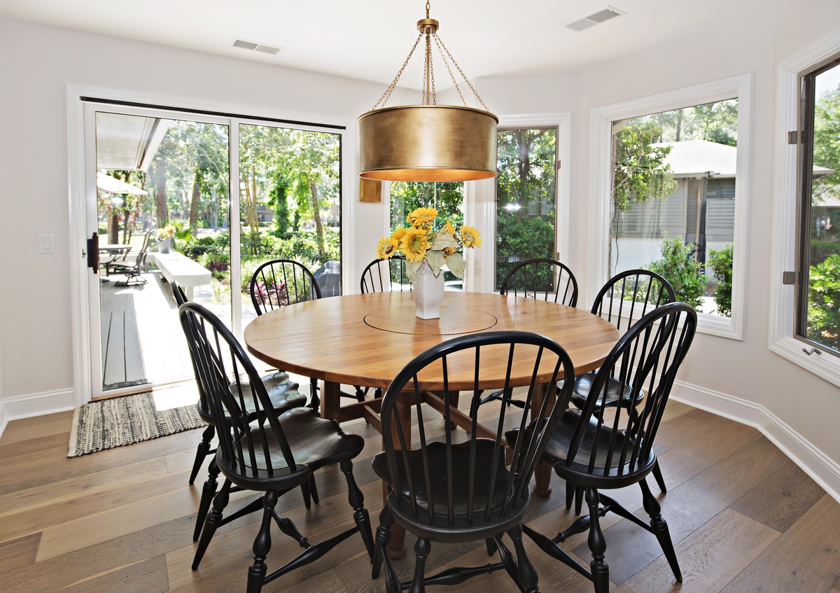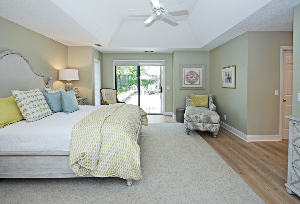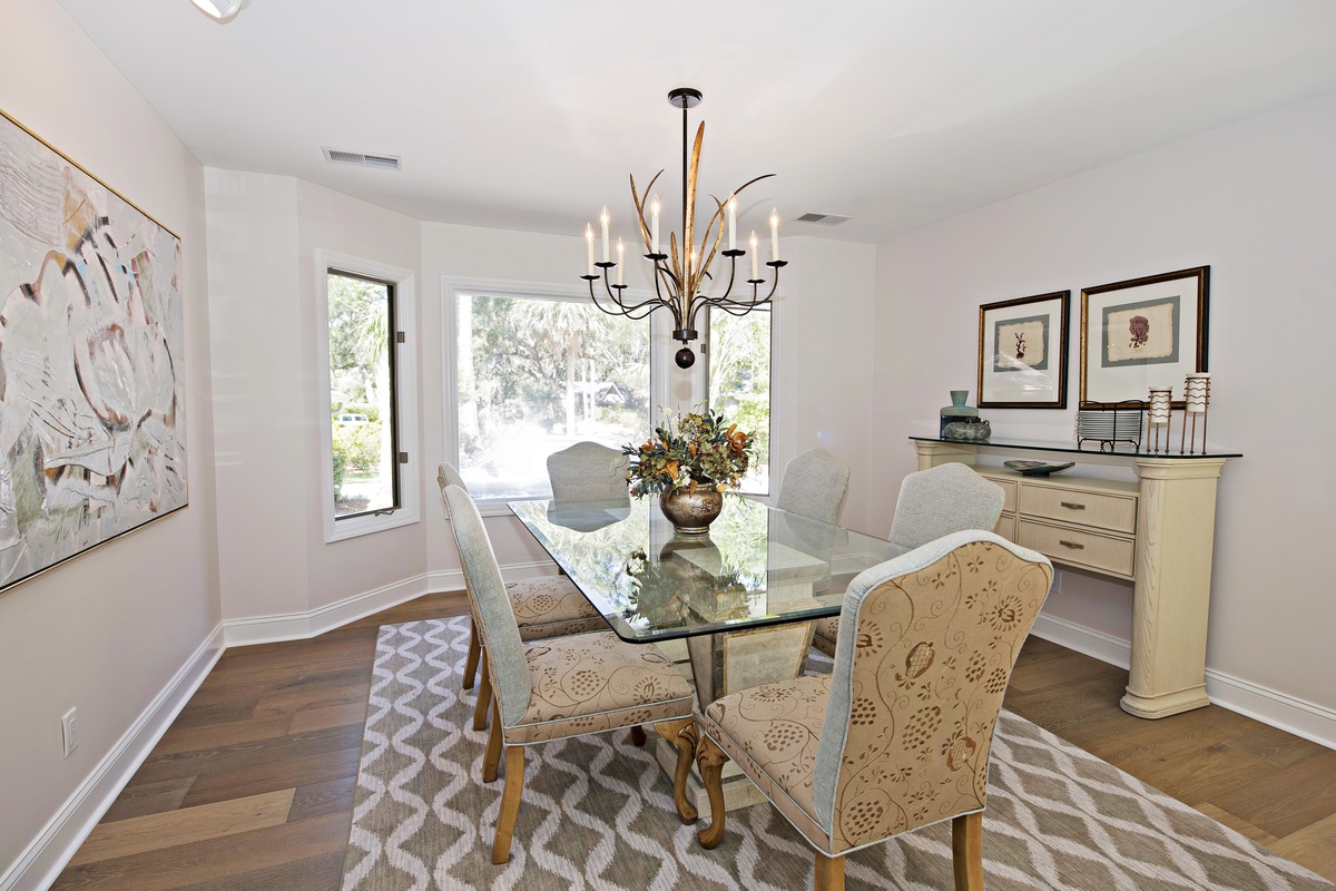 Sited in a quiet residential area of Sea Pines, this home brings light indoors with its pale hardwood flooring, freshly painted cream colored walls, and white and beige furnishings. You will instantly feel “on vacation” here as a neutral decor captures its essence from shoreline hues of sand and dunes.