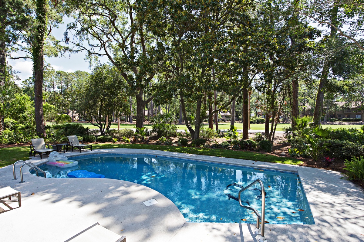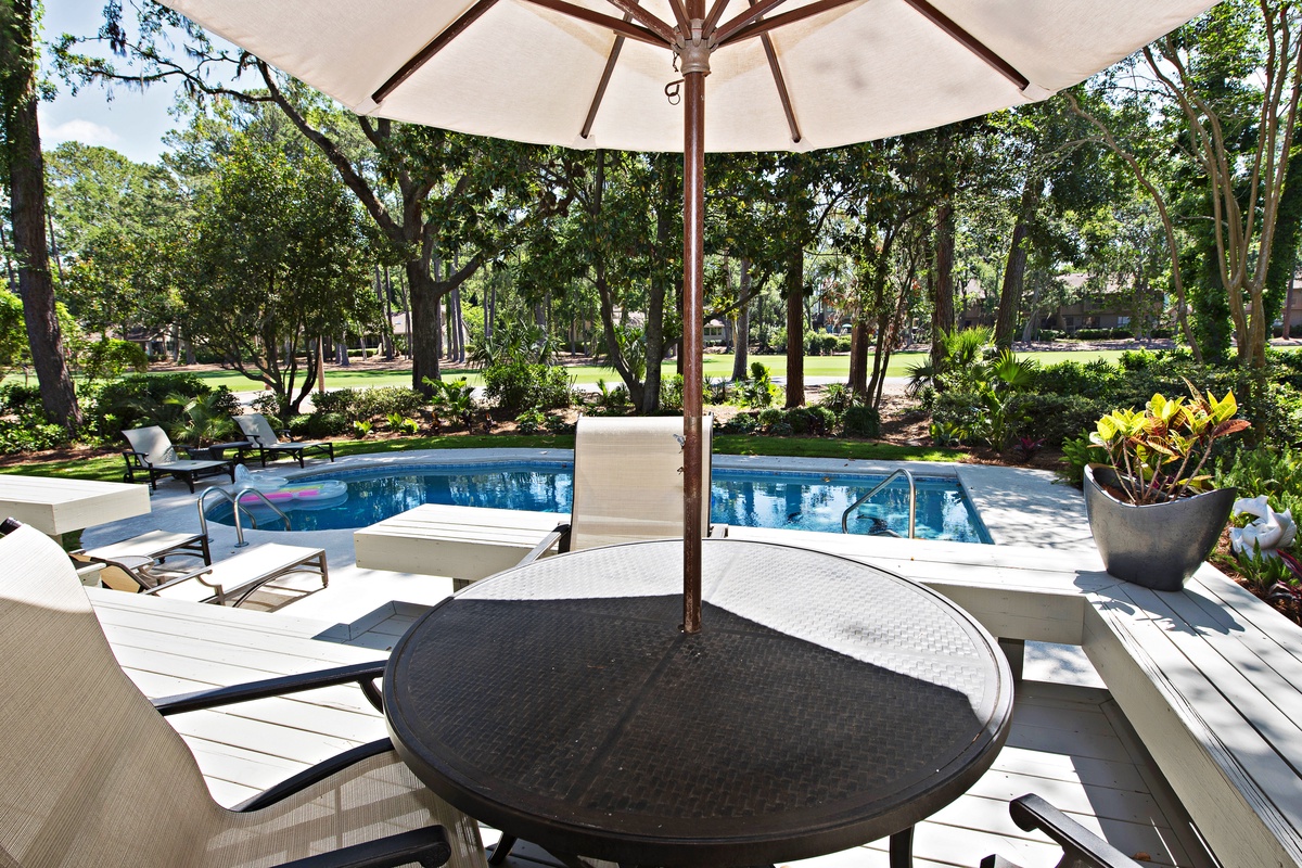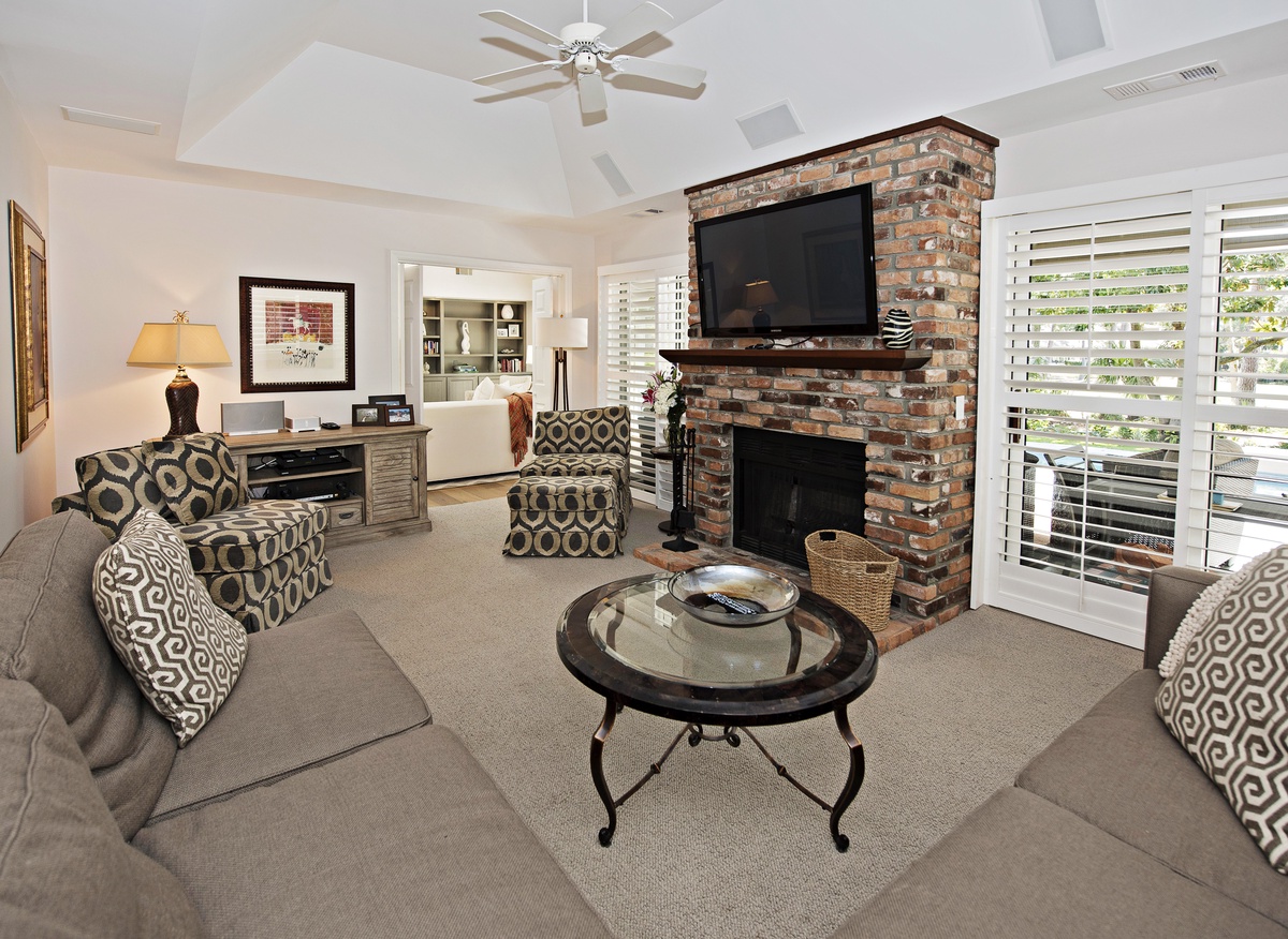 Viewing the second fairway of the Harbour Town Golf Links, and its own backyard pool, the living room features a ceiling fan, vaulted ceilings, skylight and a dining room which seats six.