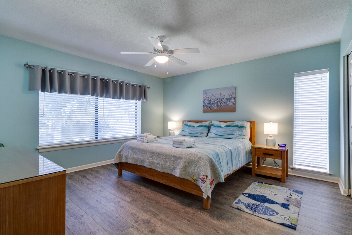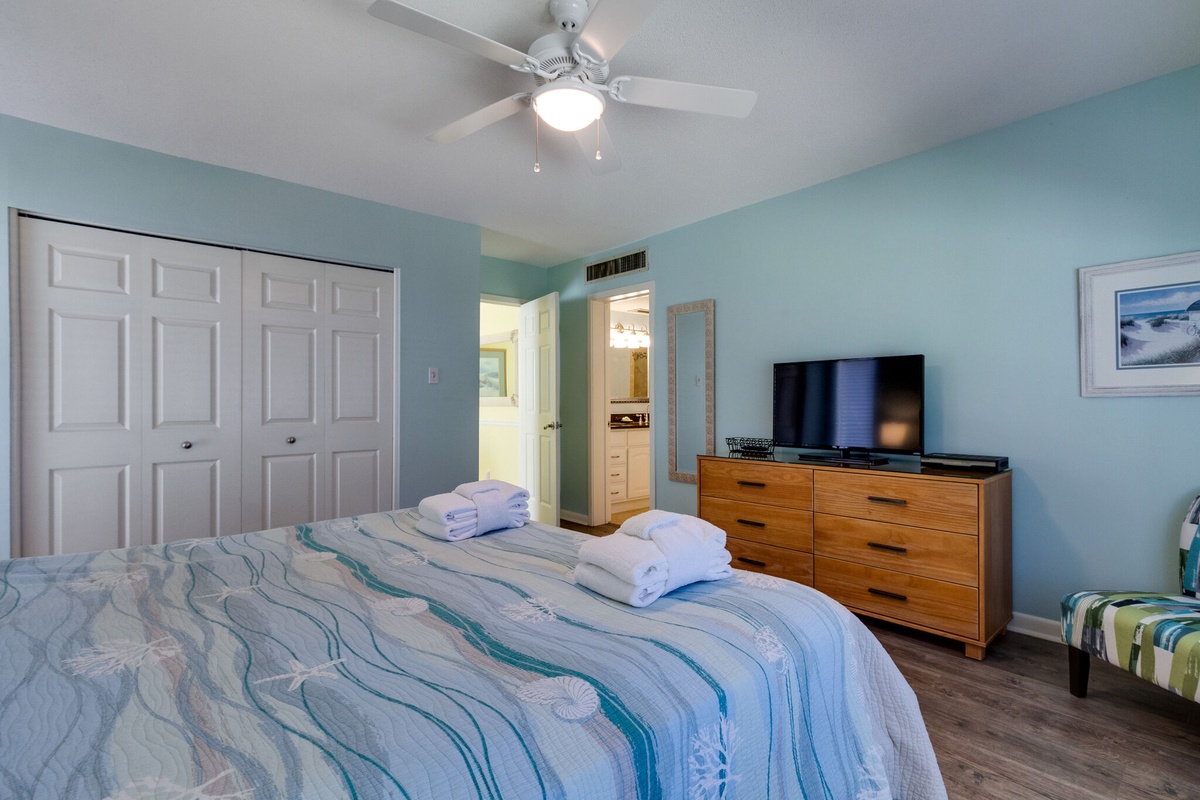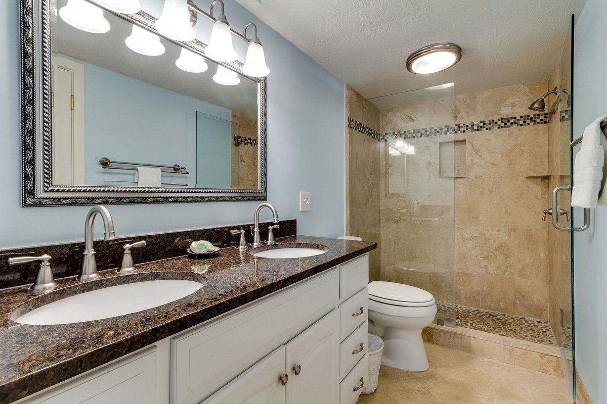 The second floor holds two bedrooms including the master, which features lovely, brand-new furnishings including a king sized bed with muted Atlantic blue and green cover, new soft Berber carpeting and an armoire that encloses a flat screen TV and DVD player. This bedroom overlooks the tennis courts as well. In robin’s egg blue, the master bathroom features Saturnia flooring, granite double vanity with brushed nickel fixtures, and pebble-floored stone surrounded shower with a glass door.