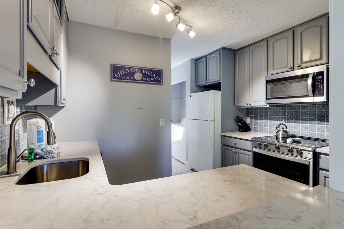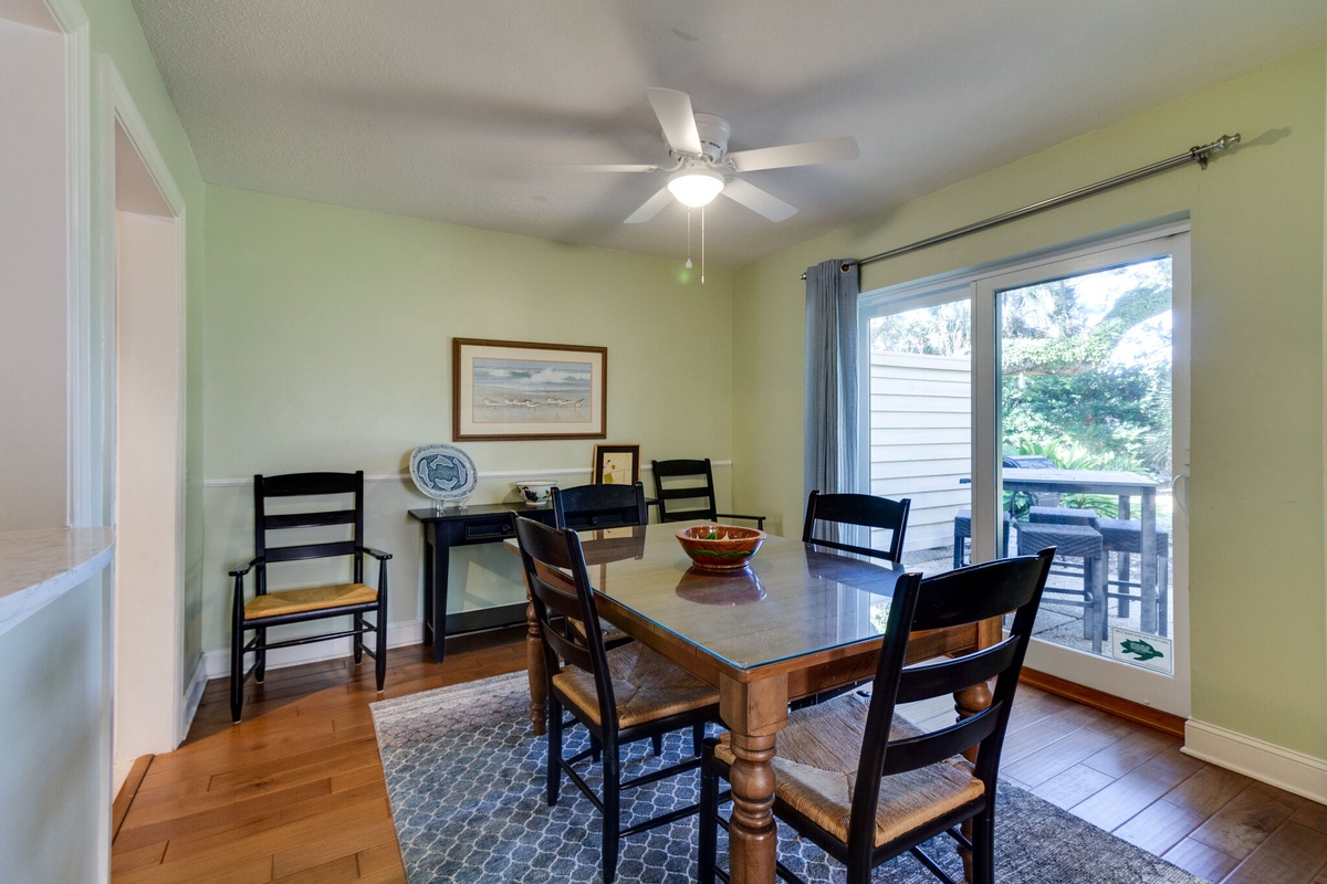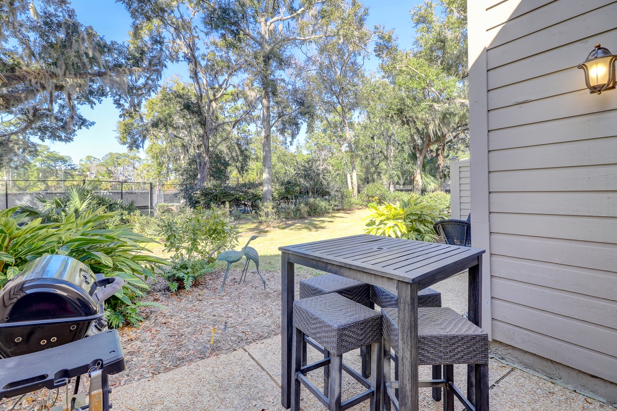 Sliding glass doors open to a pebbled patio where you can enjoy great conversation and delicious snacks and drinks with friends and family whilst relaxing on a stylish and comfortable patio set situated amid moss-draped Oaks and overlooking the neighboring Sea Pines Racquet Club’s har-tru tennis courts.