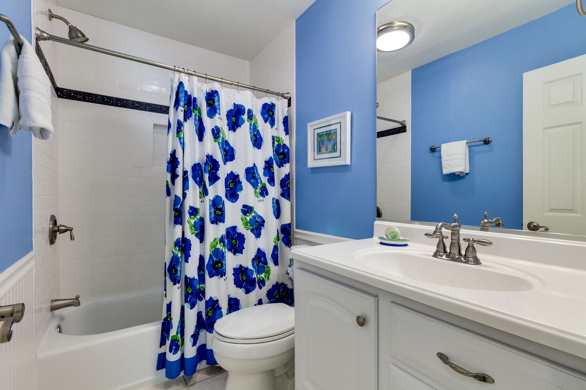 With white furnishings and a beach motif, the second bedroom features a flat panel TV, two double beds covered in whimsical lime and white. In Caribbean blue, the private bath features tile flooring, a tub/shower combination with dark accent tile, and a farmhouse style sink with brushed nickel fixtures.