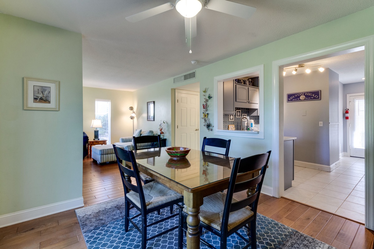 Open from the living room is the dining area, which features a farmhouse table, seating six with ceiling fan above. The dining room also has sliding door access to the patio with an additional table for four outside. There's a pass-through window from the dining room to the kitchen featuring every major appliance including a flat cooktop stove, plus solid surface oyster-hued countertops and tile flooring.
