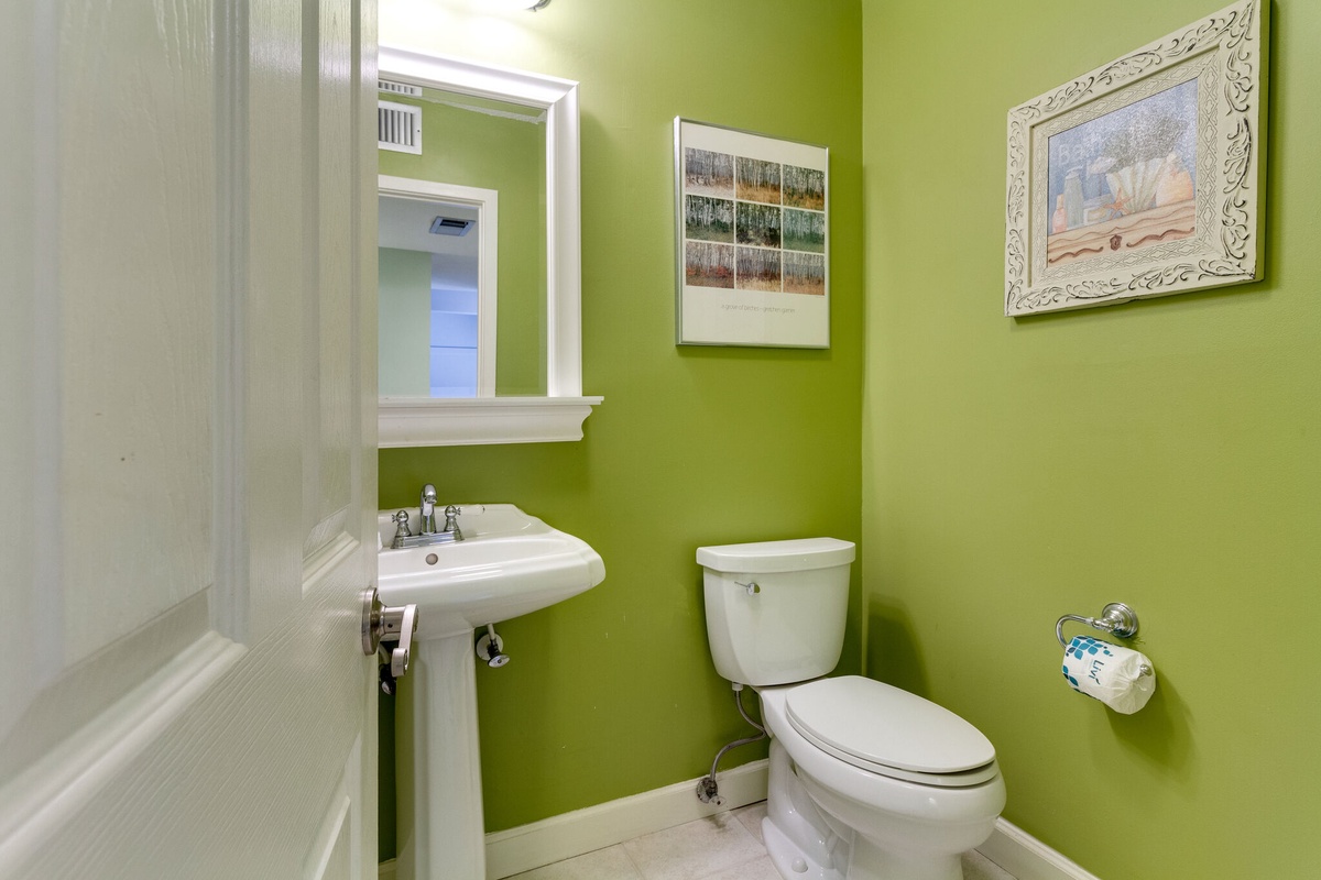 A laundry closet in the kitchen holds a full-sized washer and dryer. Also on the first floor is the foyer bathroom in cheerful apple green with pedestal sink and sconces above.