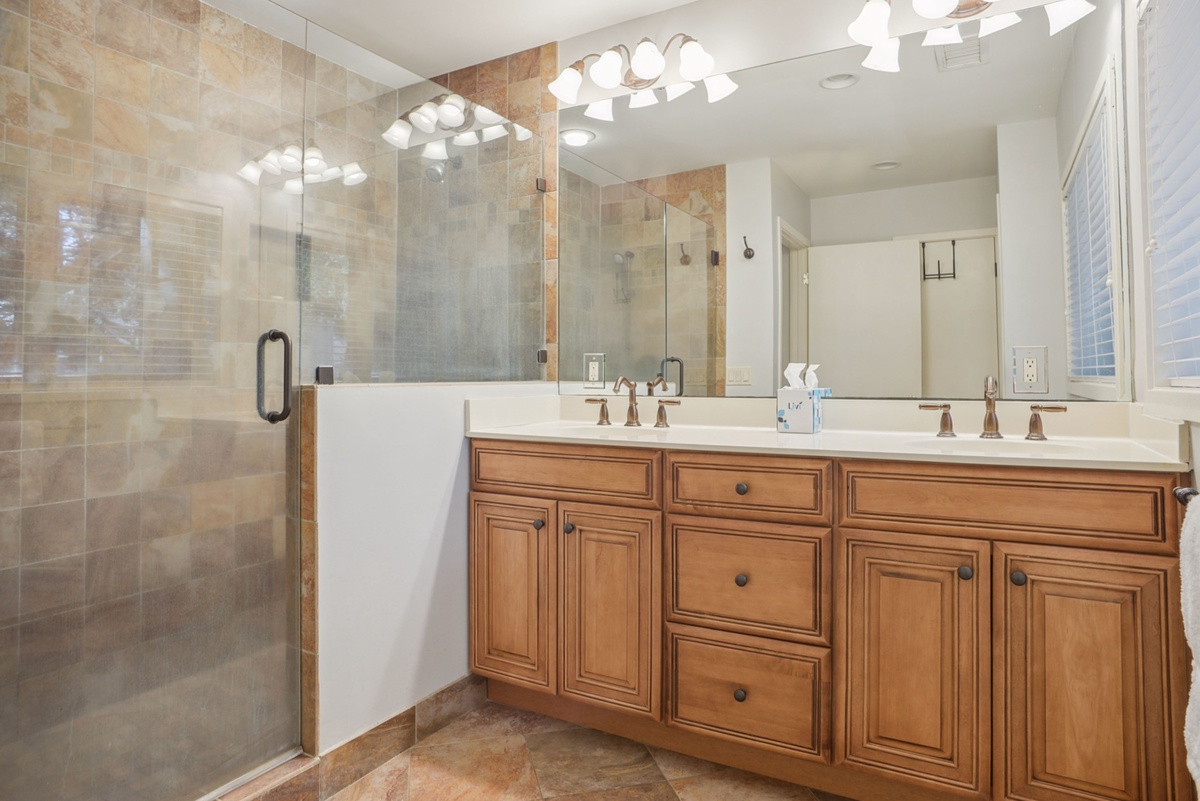 A downstairs bedroom could serve as a second master suite, with a roomy king-size quilted bed, flat-screen TV and ceiling fan, along with an en suite featuring a glass-enclosed stone tile shower and single basin with brushed nickel fixtures.