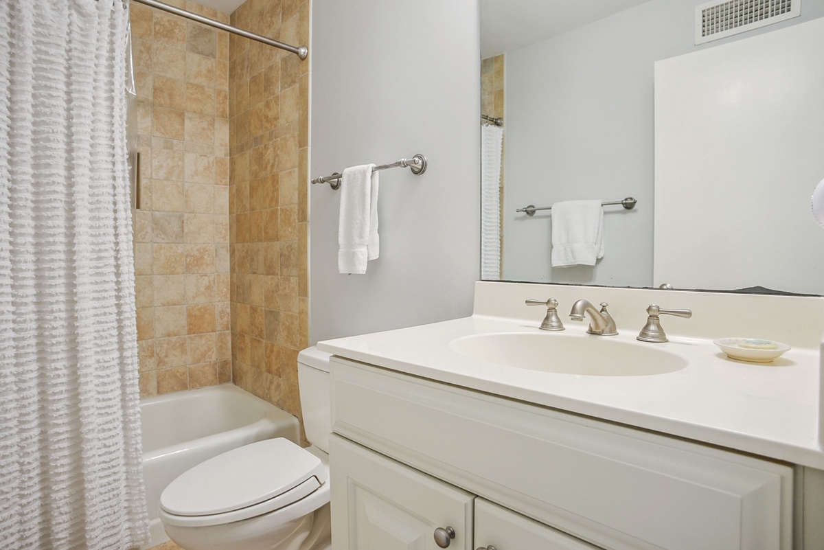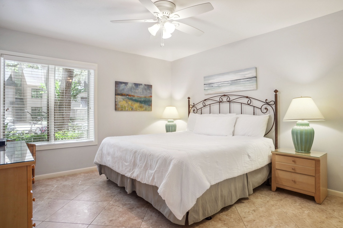 The second bedroom upstairs, the master suite, is serene and spacious. A king size bed in cerulean and white rests alongside windows that offer a view of the boughs of twisting live oaks and the tennis courts beyond. A spa-like en suite stretches a spacious double vanity toward a walk-in shower with dual showerheads and marvelous stone tiles.