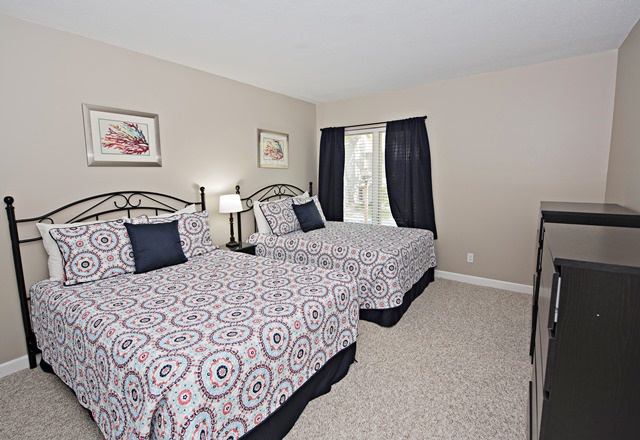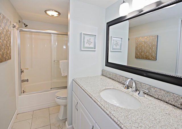 The master’s wide windows illuminate a spacious suite offering king-size bed, flat-screen streaming-enabled TV and en suite with speckled granite single basin vanity, tub and shower.