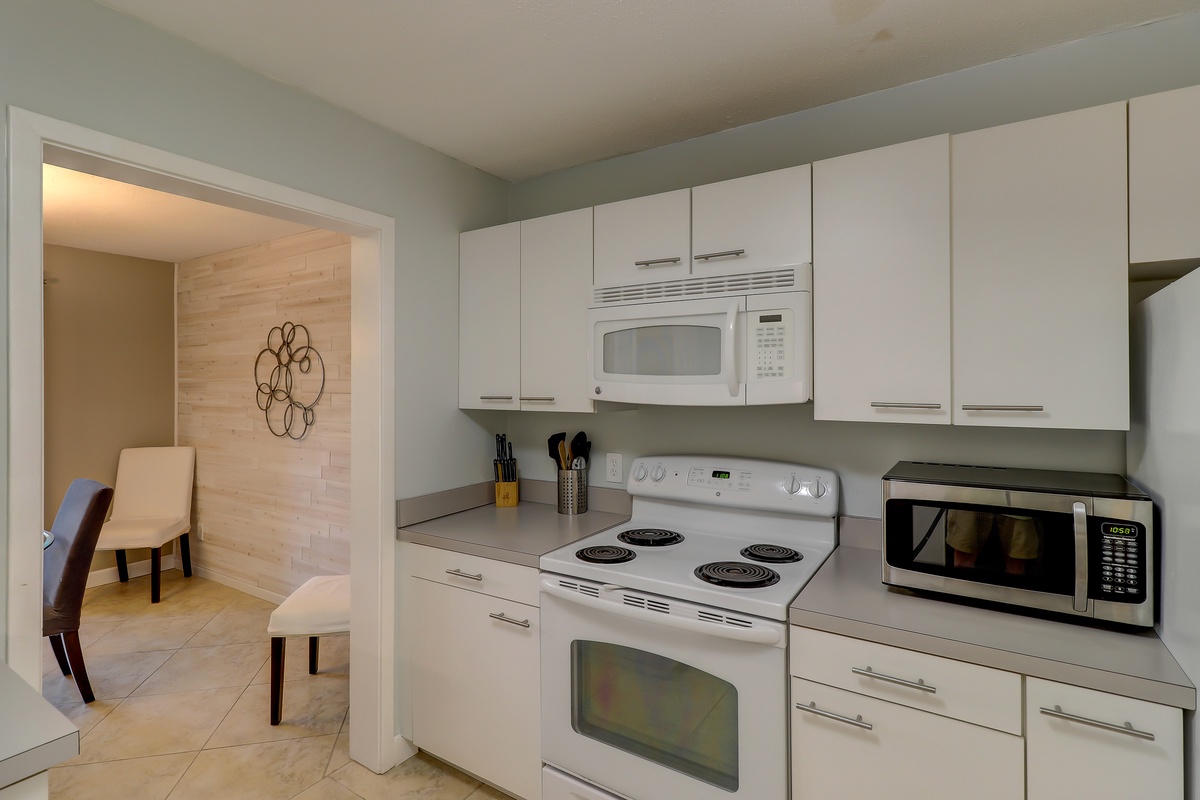 Enjoying its own set of sliders, the dining room gets a sense of spaciousness from a mirrored wall beside a glass-topped table with seating for four. It rests between access to al fresco dining on a private rear patio and a pass-through leading to the full kitchen. Here, you’ll find every amenity you need for entertaining.