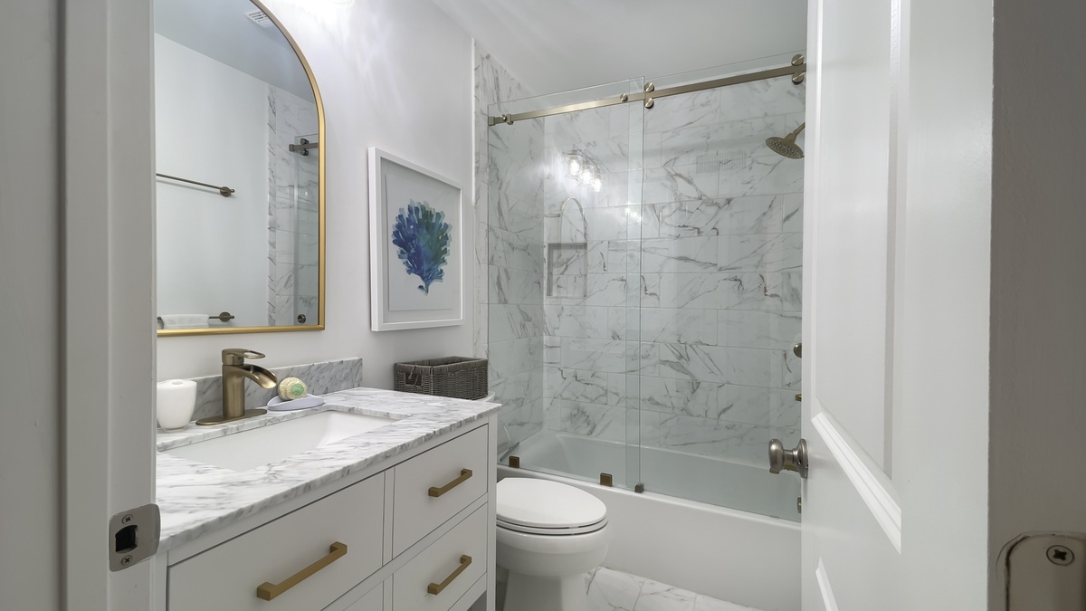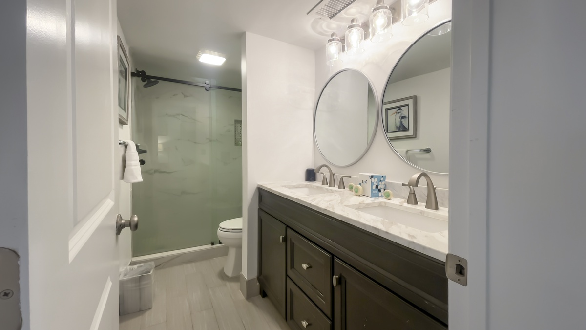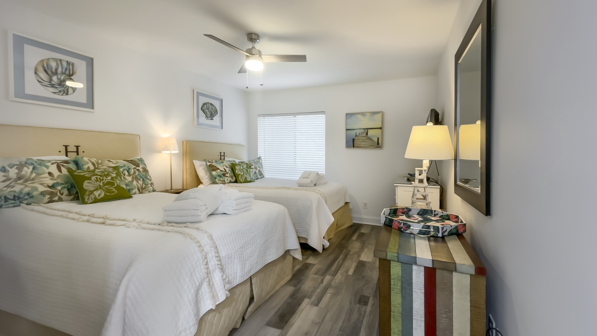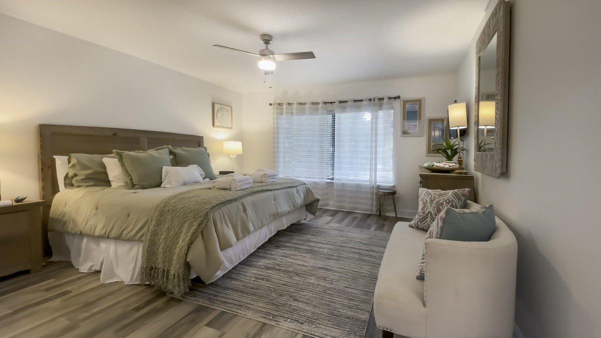The master sees a wide king bed wrapped in floral-inspired linens of teal and royal purple, in a spacious suite of tropical-inspired furnishings. An en suite offers speckled granite counters on a single basin vanity and roomy walk-in shower.