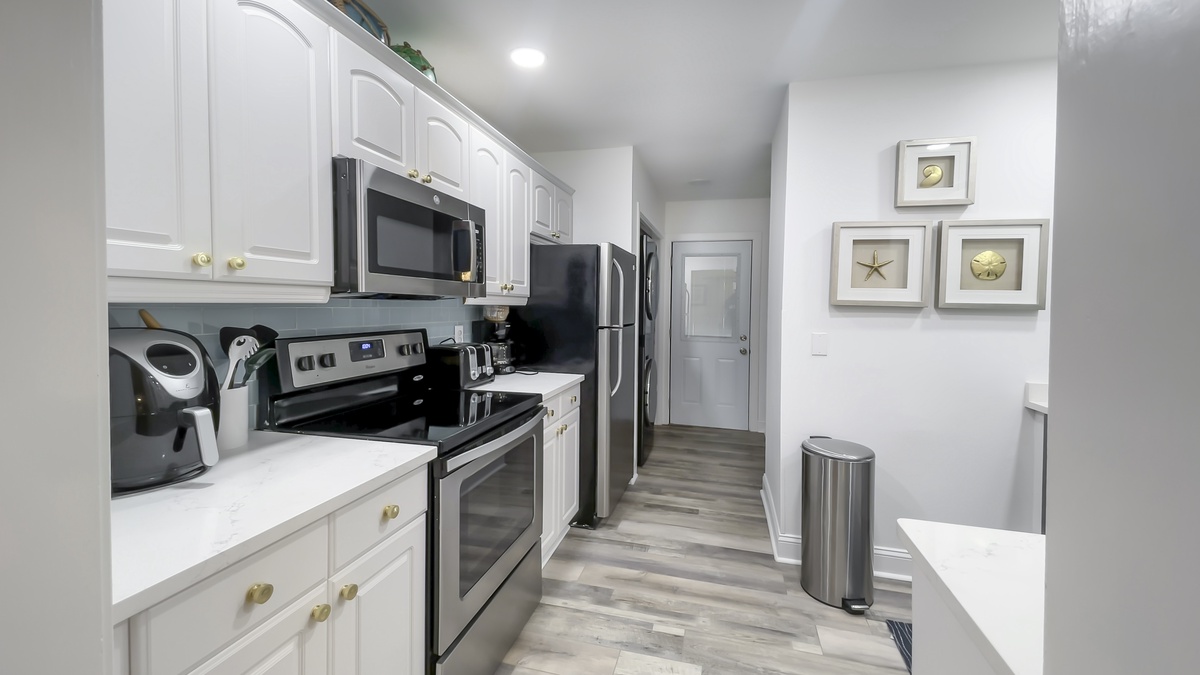 Solid surface counters in speckled gray wrap around a spacious kitchen in brilliant white. A four-burner stove and ample prep space will give the traveling gourmet a chance to whip up something memorable.