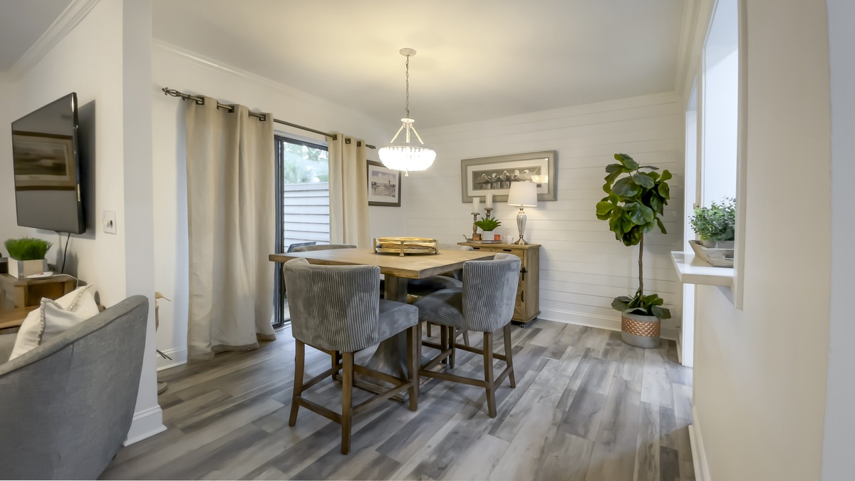 The adjacent dining room takes old-world furniture with the exquisite look of reclaimed wood in a bohemian chic palette of neutrals. Natural light streams in from a wide sliding glass doors leading out to a pebblestone patio.
