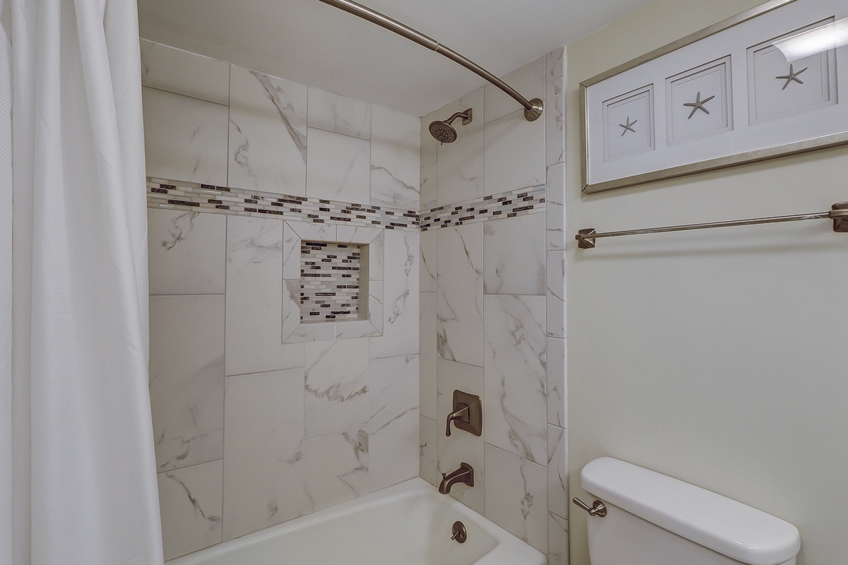 The main living space enjoys lush natural light and tranquil lagoon views, with a full sofa and two upholstered chairs from which to enjoy them. Of course, they are best enjoyed from the outdoor surrounds of the covered patio gazing out toward the water. When the sun goes down, draw the curtains and settle in before the living room’s massive flat-screen TV.