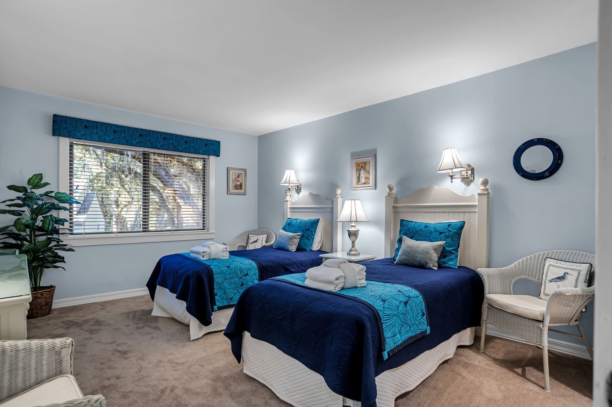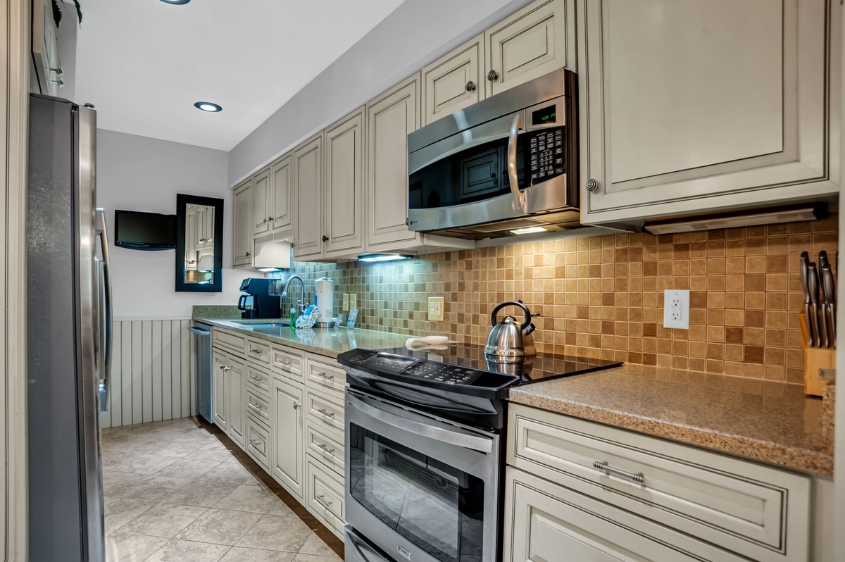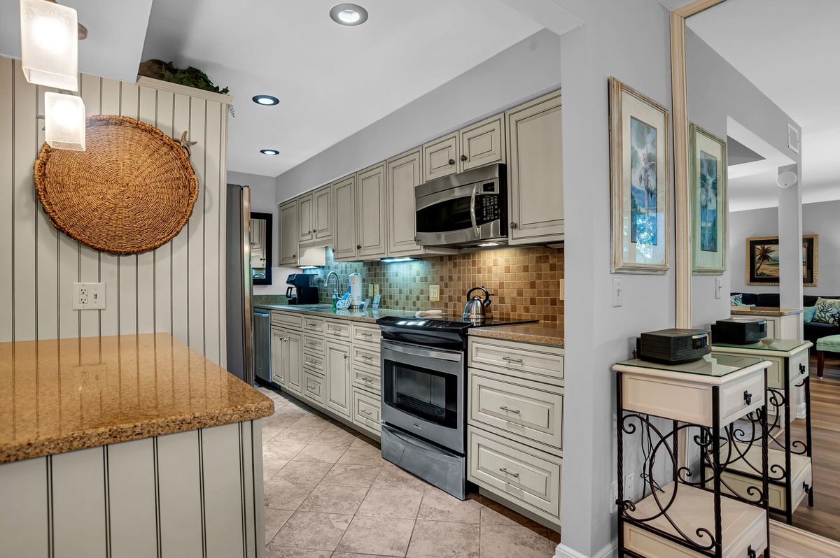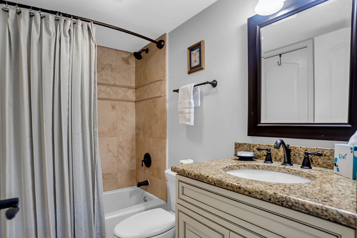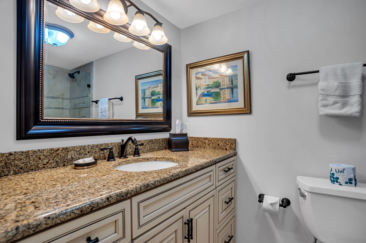 In robin’s egg blue and a nautical motif, the second bedroom features two twin beds, a TV and dual closets. The bath offers a granite vanity and a stone-surrounded tub/shower combination. In the hallway, convenient to both bedrooms, is a laundry closet with stacked washer and dryer.