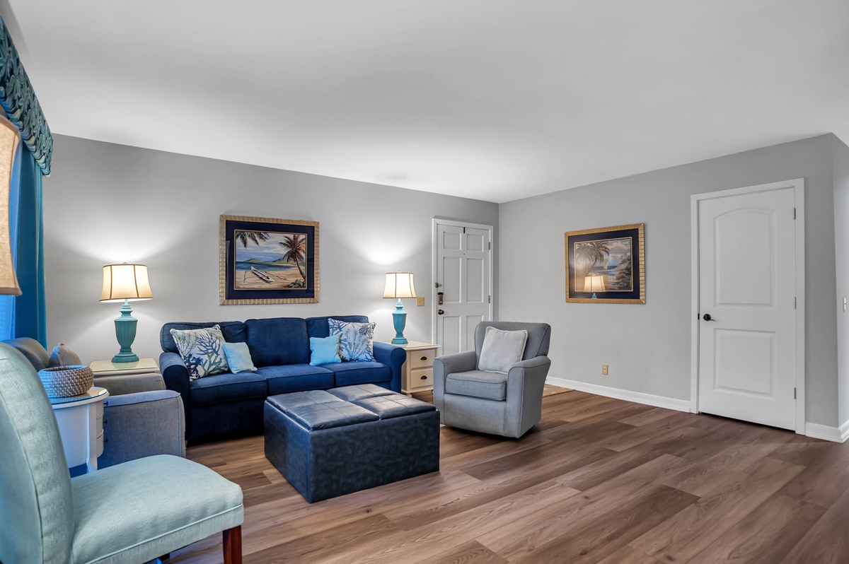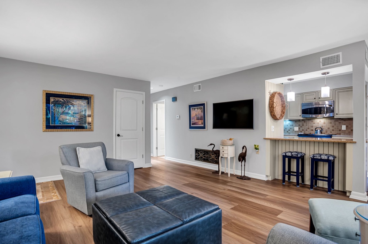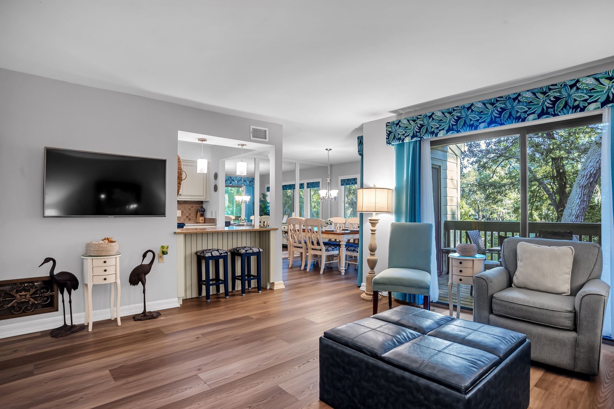 A neutral palette with tropically aquatic accents of color, the charming living room offers comfortable seating with a blue-colored sleeper sofa and upholstered swivel chairs, plus a 48-inch flat screen smart TV.