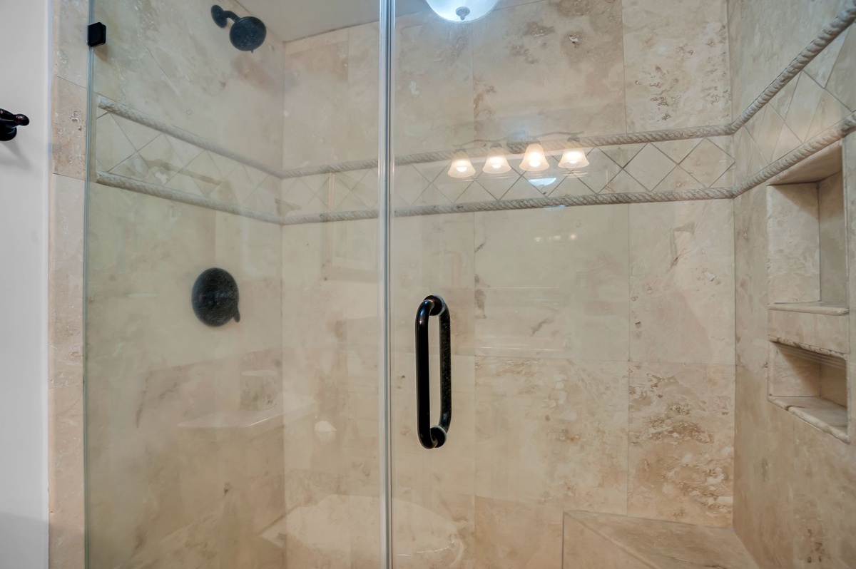 In a cream-hued tones with strokes of color, the master bedroom offers a king sized bed with beadboard furnishings. The peaceful bedroom offers comfortable seating and a large wall-mounted TV as well as his-and-her closets. The master bath showcases tan and brown granite vanity with oil-rubbed bronze fixtures and a glass door tile surrounded shower with corner bench.