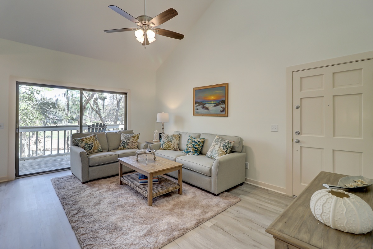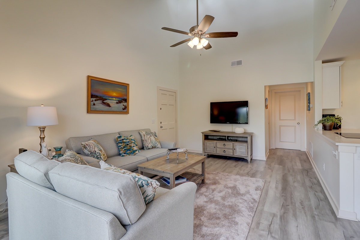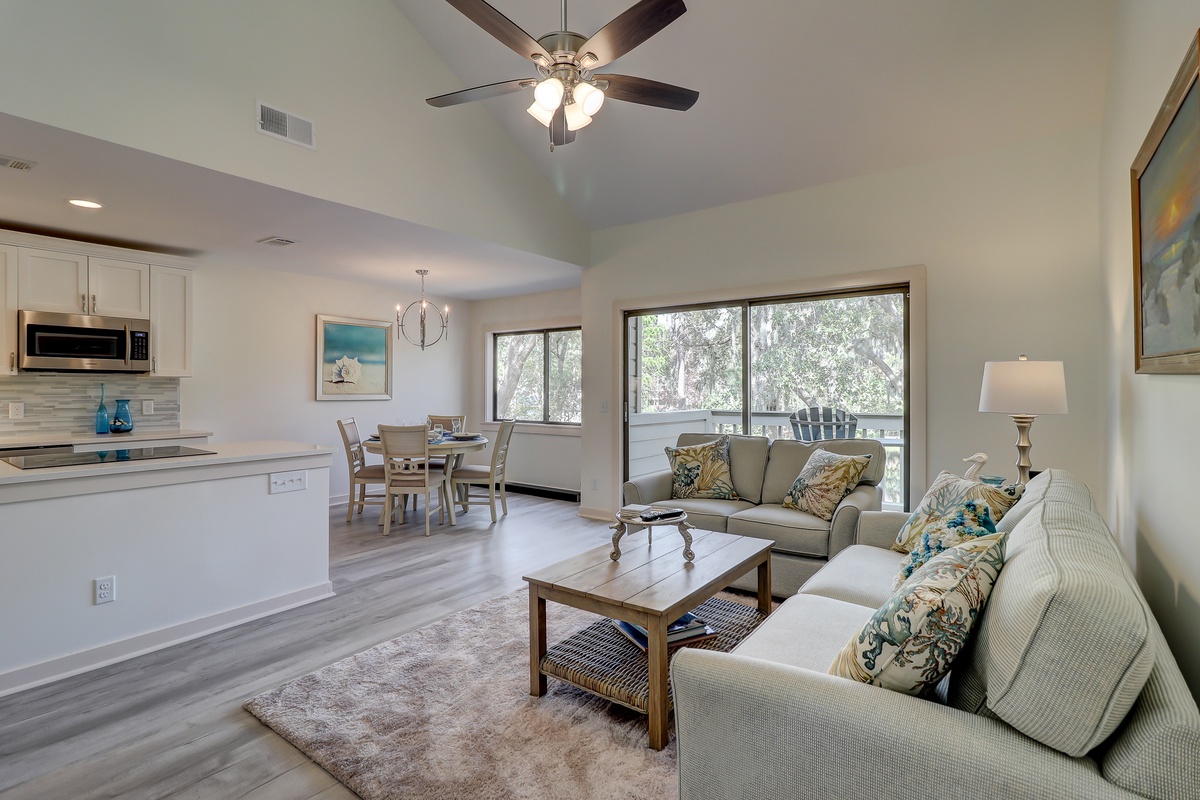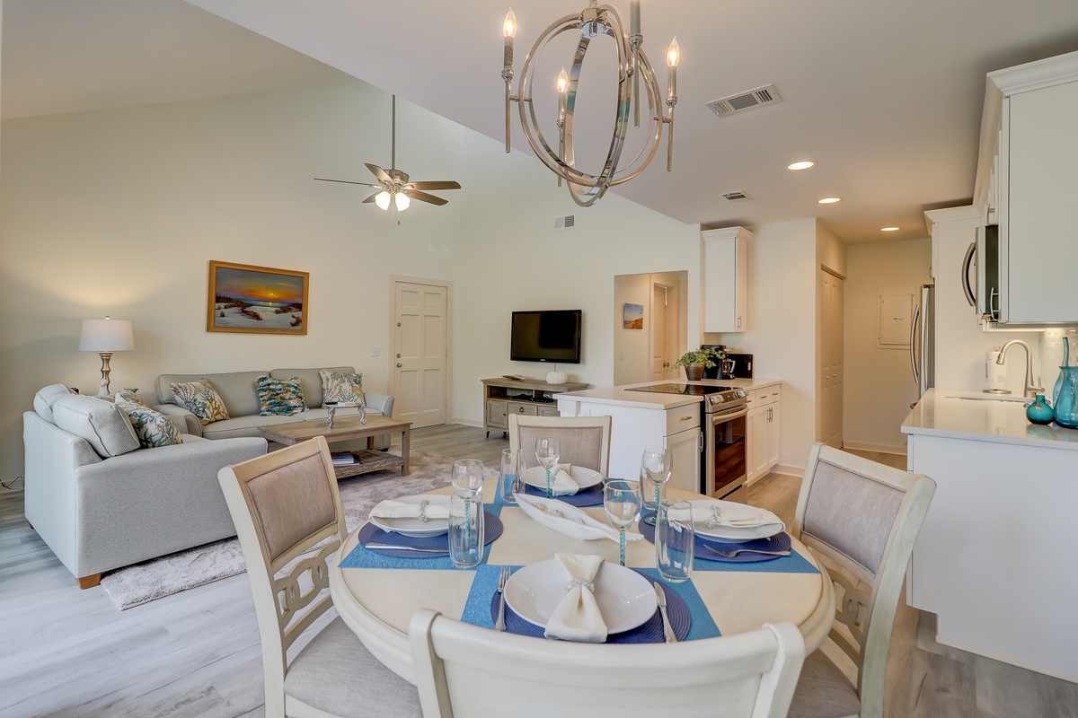 The open concept living space allows lush natural light to stream in from a wall of sliding glass, which in turn give way to a picturesque deck overlooking a tranquil lagoon and the 11th hole of Heron Point by Pete Dye. Inside, tall ceilings and skylights illuminate a conversation area with flat-screen TV, sleeper sofa and loveseat oriented toward the open kitchen and dining area. Set beyond a grand counter of marbled granite with flat-cooktop stove, the open and updated kitchen boasts a fleet of state-of-the-art stainless-steel appliances, new cabinets and materials, plus a washer/dryer for the convenience of home.