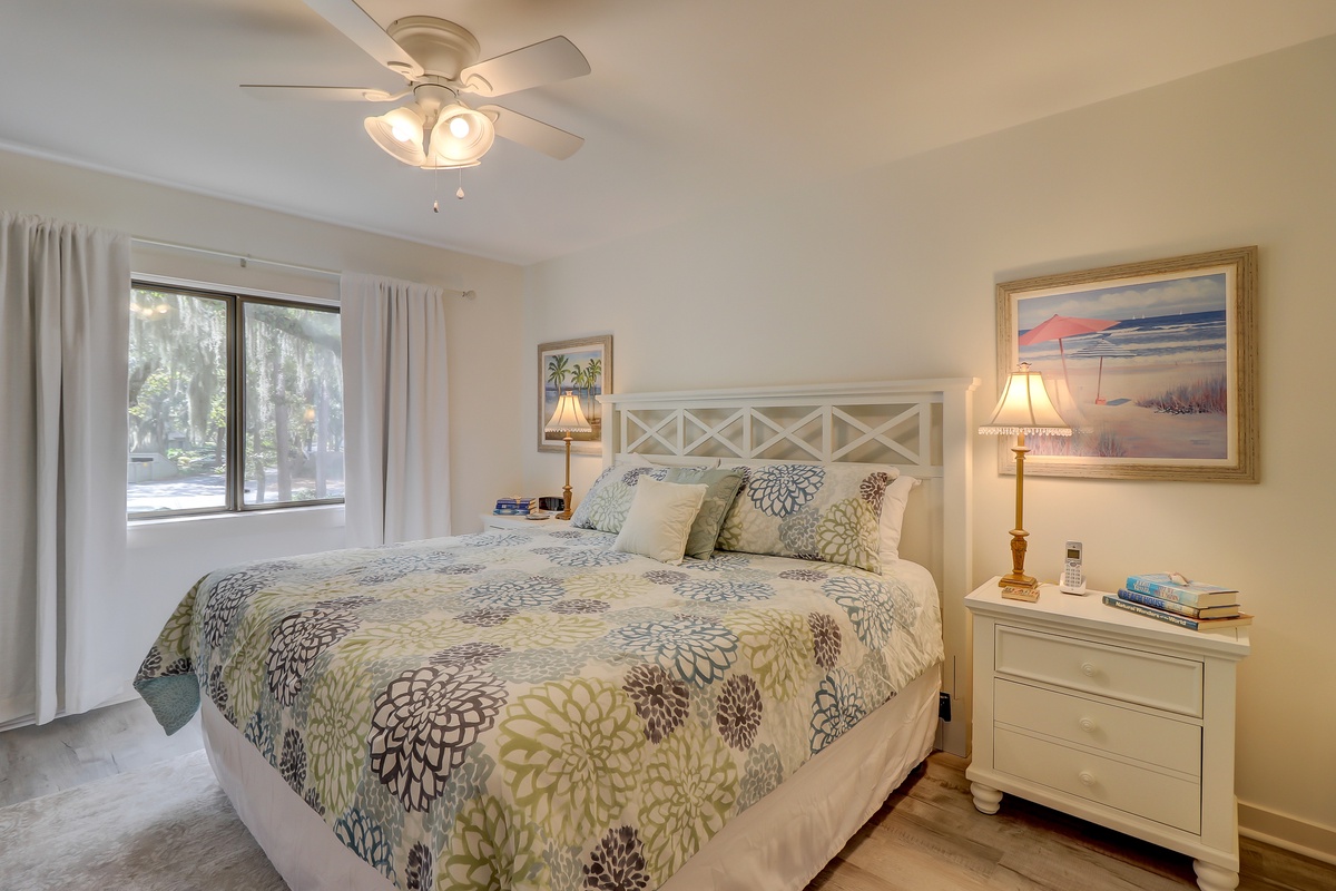 The updates continue in the master bedroom, where a coastal chic vibe informs a resort-style space with large king-size bed, ceiling fan, flat-screen TV and wide windows. And for the full four-star experience, step into the enormous walk-in shower in the nearby bath, with its riverstone flooring and custom tile work.