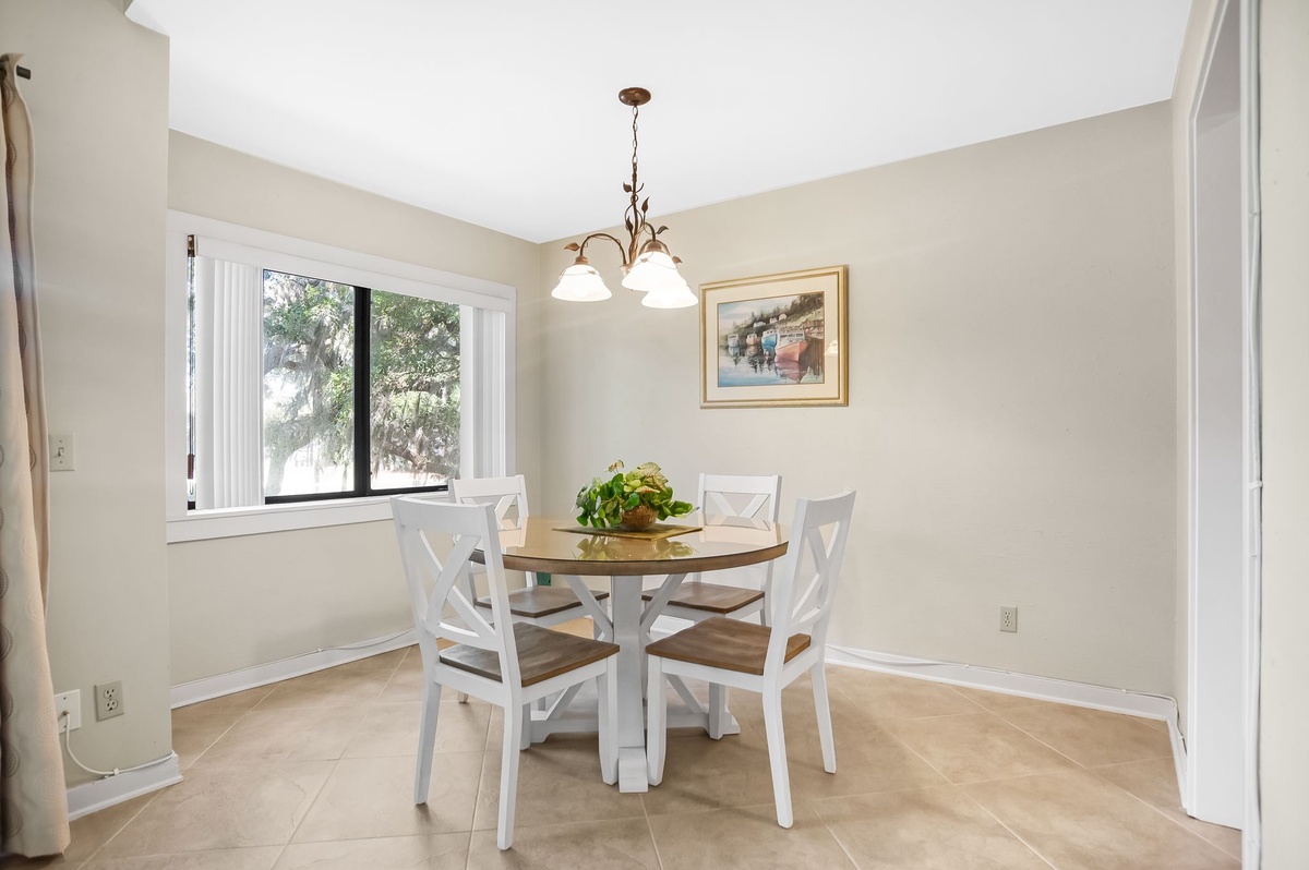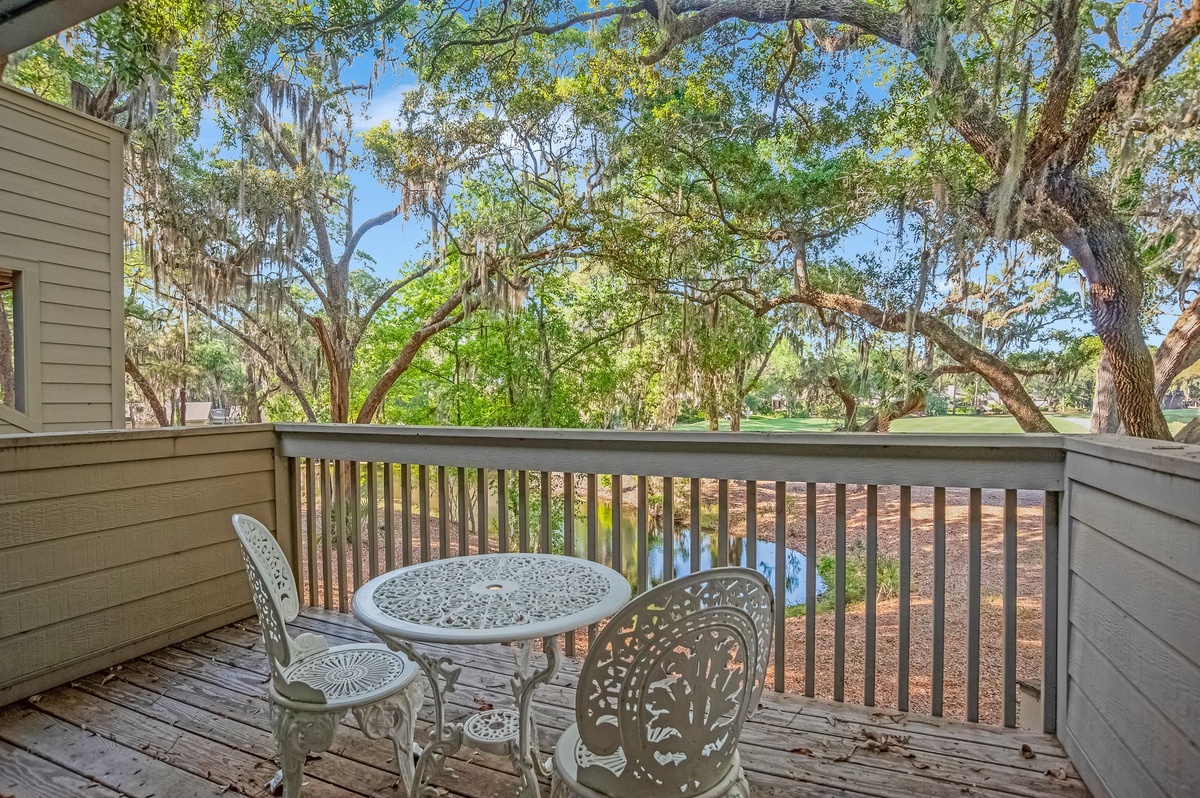 Stepping in, you are surrounded by natural light thanks to soaring ceilings leading up to skylights, as well as a bank of tall windows and a sliding glass door. Step outside, and you’re on a cozy patio with seating for two at an antique-style white wrought-iron table offering breathtaking views of the 11th fairway at Heron Point by Pete Dye.