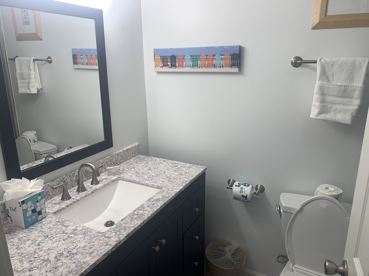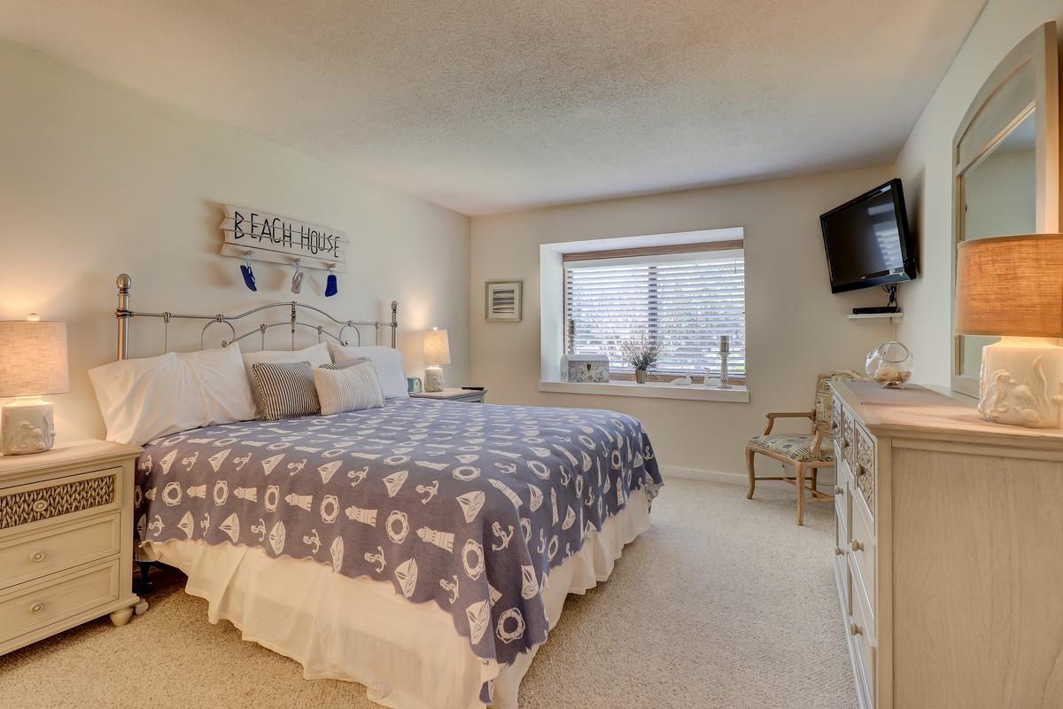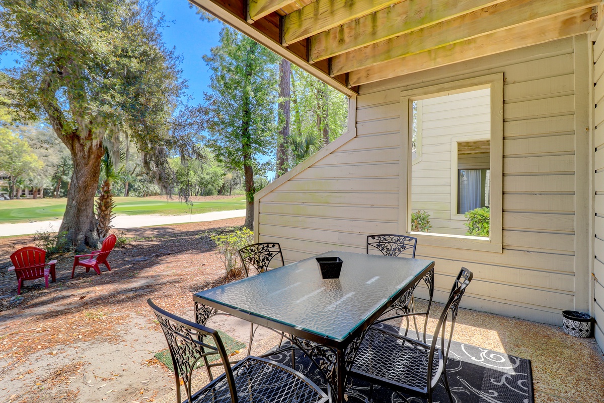 The open living space sees a plush sleeper sofa facing a large flat-screen TV and flanked on one side by a mirrored wall for a sense of spaciousness, and by stunning golf views on the other. Step through sliders, and you’re immersed in a panoramic view of the 11th hole at Heron Point by Pete Dye. Set a spell on the pebblestone patio and drink it all in.