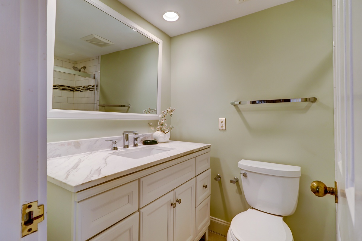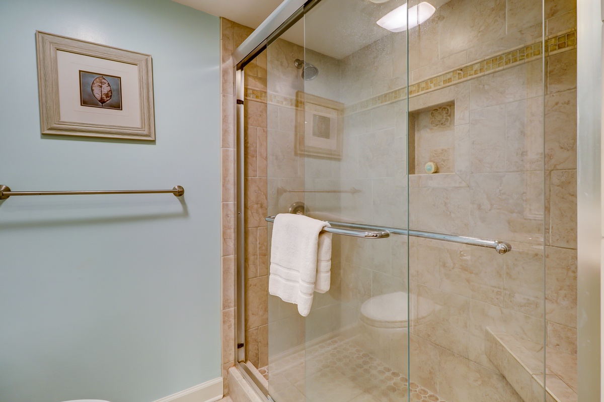 The second bedroom offers twin beds in a soft palate of hues, white furnishings and a bathroom with wide vanity and tub/shower combo.