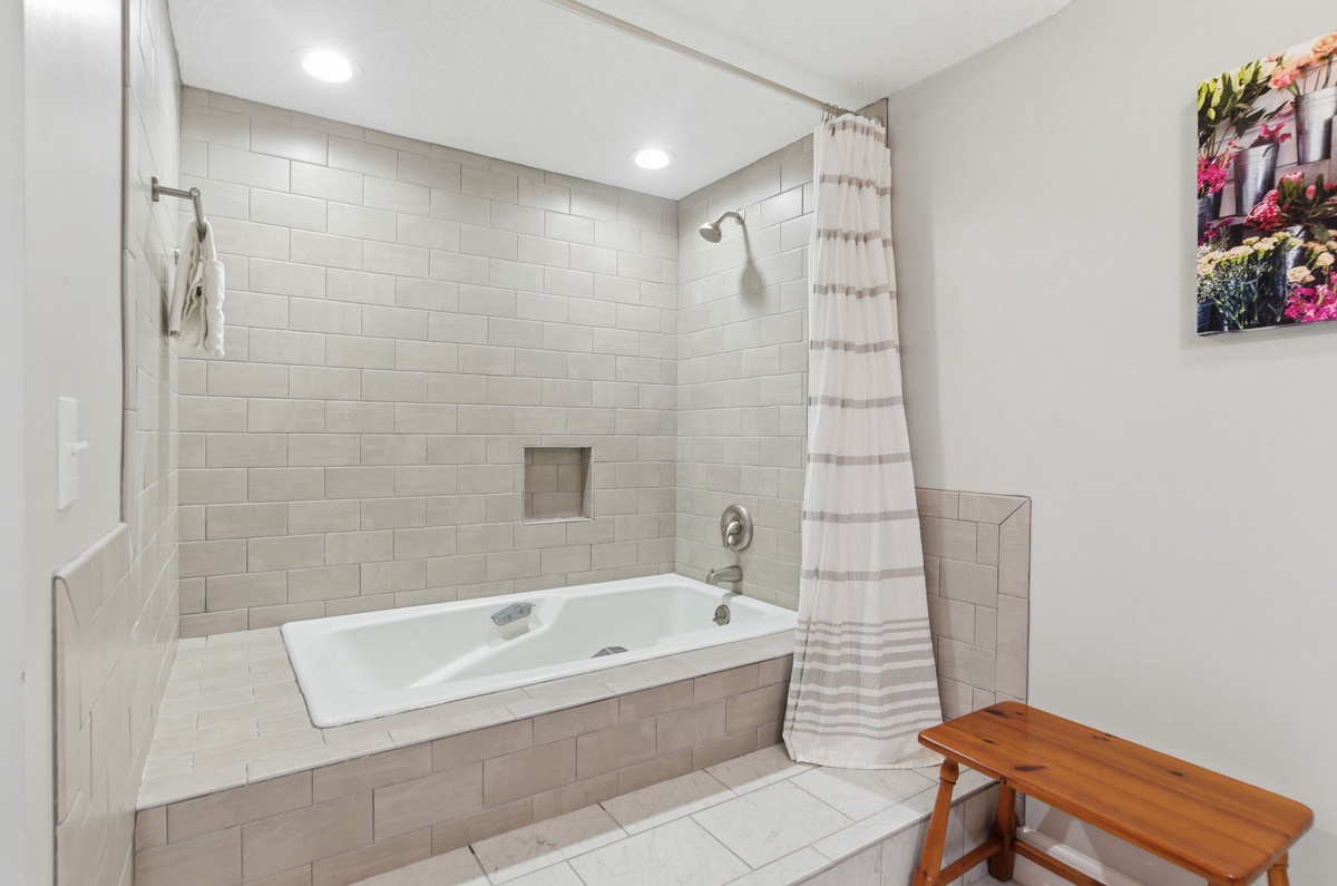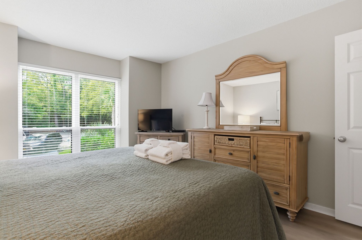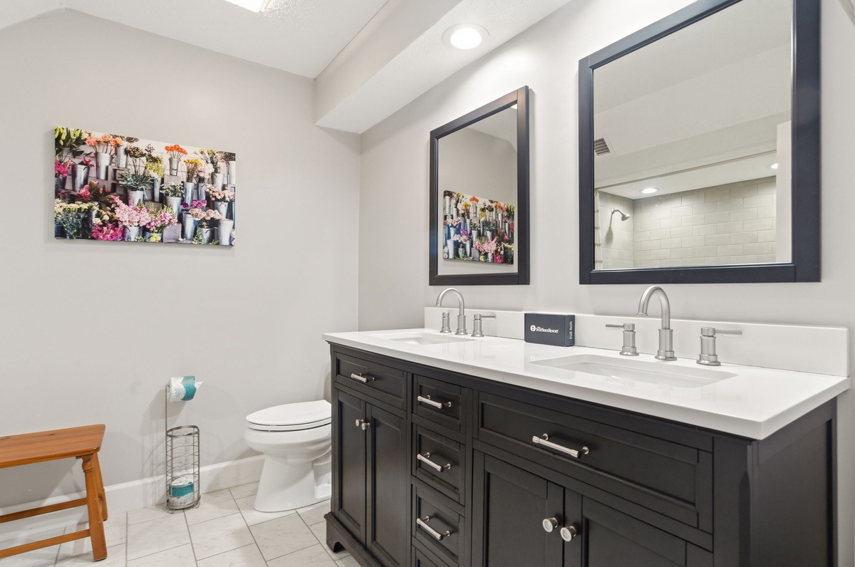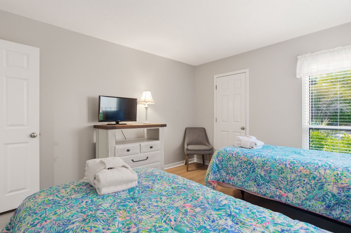 Heading down a corridor where a washer and dryer are neatly concealed for all the convenience of home, we come to two lavish guest rooms. In the first, a pair of twin beds enjoy a space with flat-screen TV, windows on two walls for lush natural light and access to a full bath with tub and shower. The next serves as an owners’ suite, placing a king-size bed amid amenities like a flat-screen TV, and spa-like en suite with dual-basin vanity, expansive soaking tub and shower.