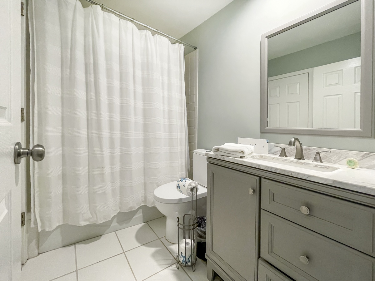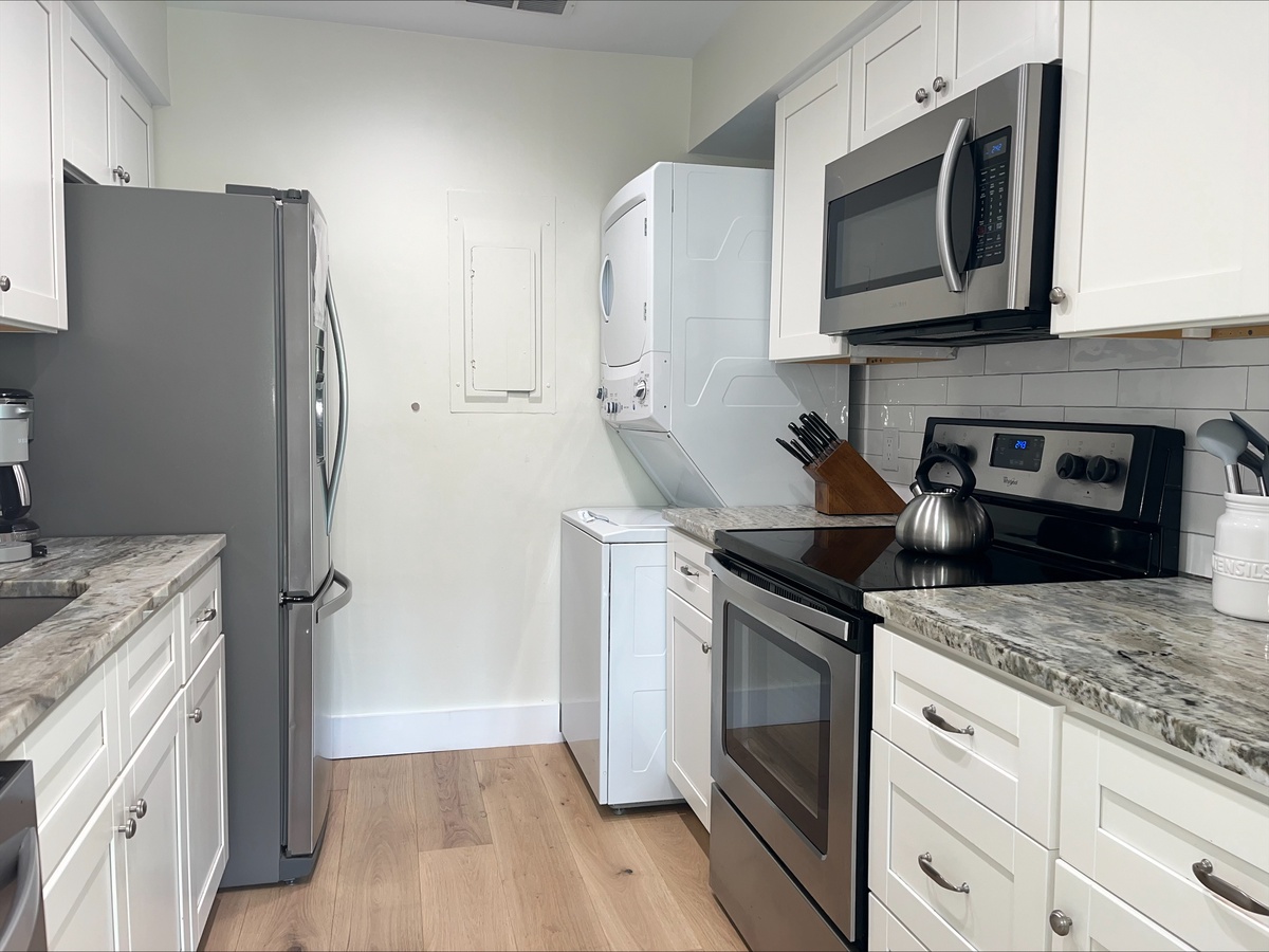 Nearby dining for four enjoys wide-windowed views down to the lagoon and easy access to the spacious galley-style kitchen. Outfitted with updated stainless-steel appliances and granite counters, the kitchen also offers a washer and dryer for convenience.