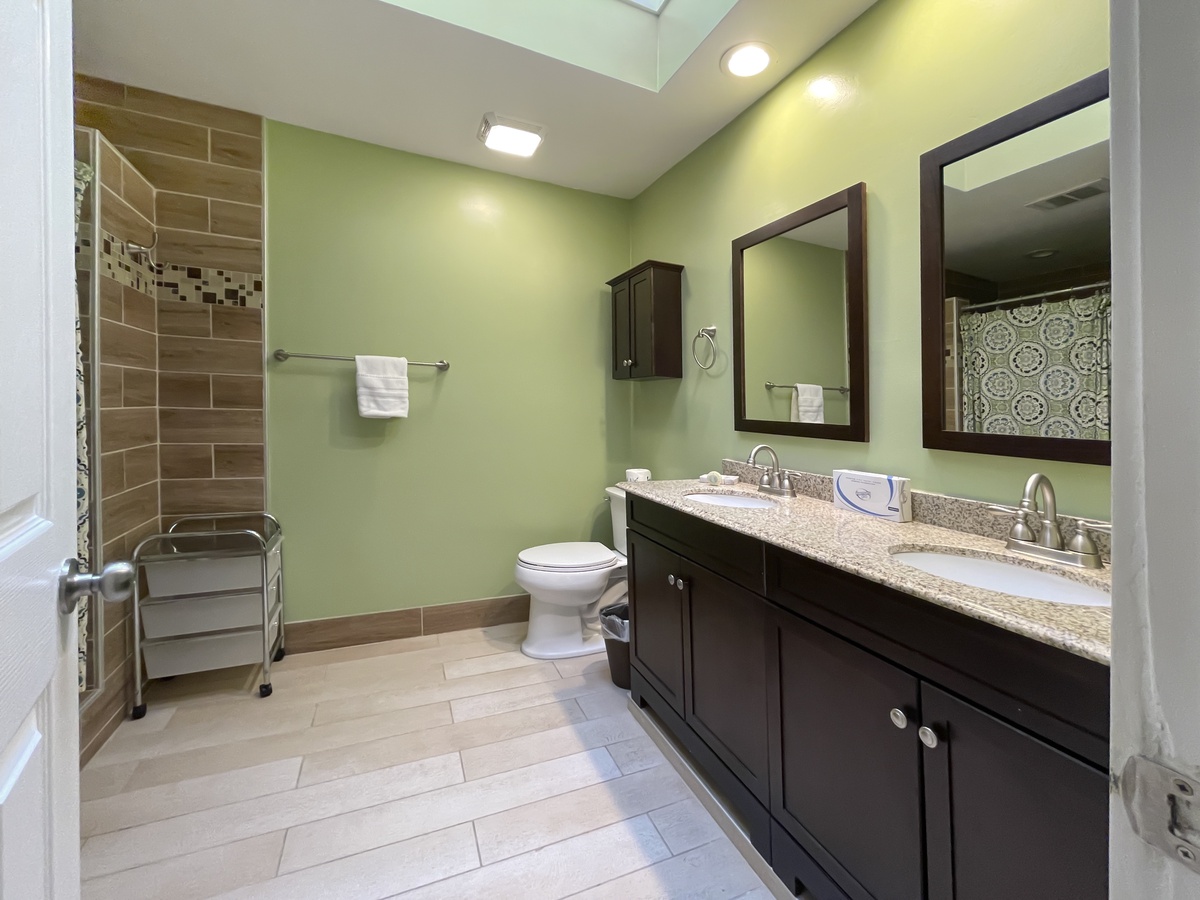 The first of the two lushly comfortable guest rooms offers a queen-size bed set beneath soaring ceilings with fan, plus a flat-screen TV and access to a private bath with tub and shower. The second guestroom expands to a king-size bed in a space with flat-screen TV, ceiling fan, wide windows and expansive en suite bath. Illuminated by a skylight, this spa-like oasis offers a massive walk-in shower with dual showerheads.