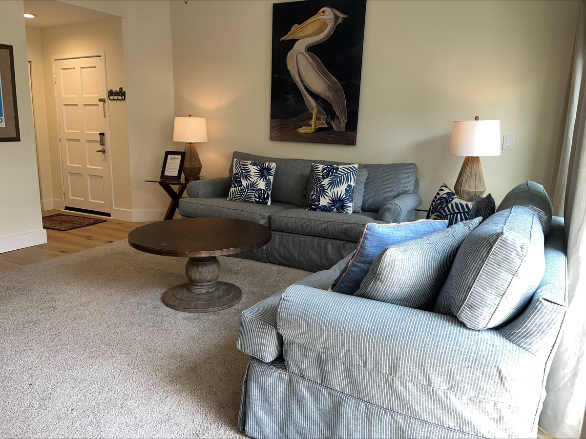 An open living space invites you in, bathed in natural light from a wall of windows. Here, a sleeper sofa and loveseat face a flat-screen TV flanked by a sliding glass door guiding out to an elevated deck. Here you can unwind to the serene splashing of the lagoon’s fountain below.