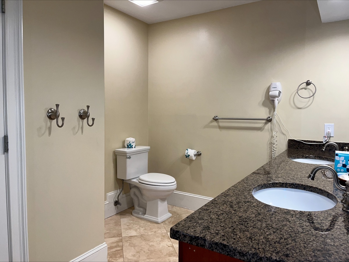On the main level is a candlelight-hued bedroom featuring a king-sized bed, flat screen TV, and sliding glass doors to the front balcony. Its lovely bathroom has stone flooring, a walk-in shower and a wall-mounted blow dryer.