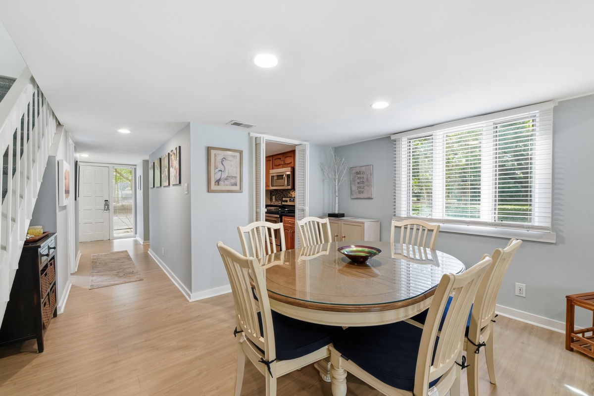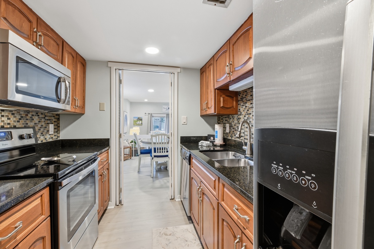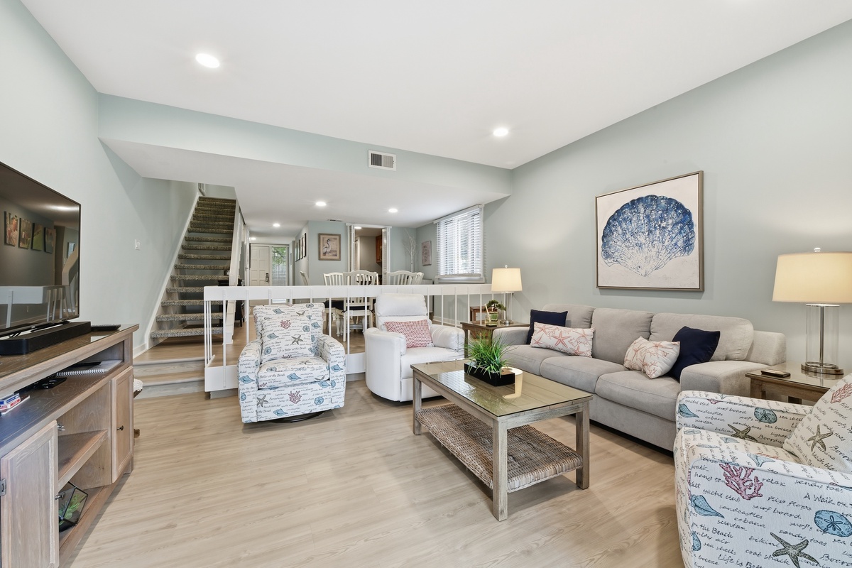 The open living space sees a plush sofa and armchairs set before a flat-screen TV, with dining for six just up a short set of steps. A set of sliding glass doors to one side bathe the room in natural light and give way to a roomy covered patio with bistro table and lushly landscaped views. Off the dining room, a galley-style kitchen sees granite counters surrounding stainless steel appliances for style and convenience of home. A nearby half-bath rounds out the amenities of the main living spaces.