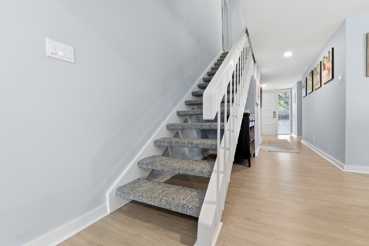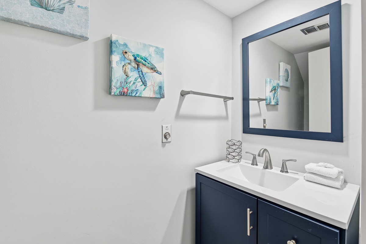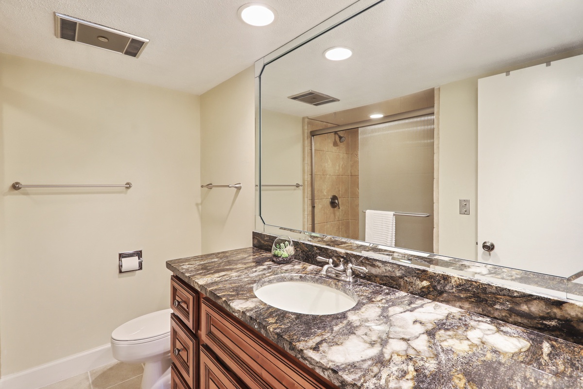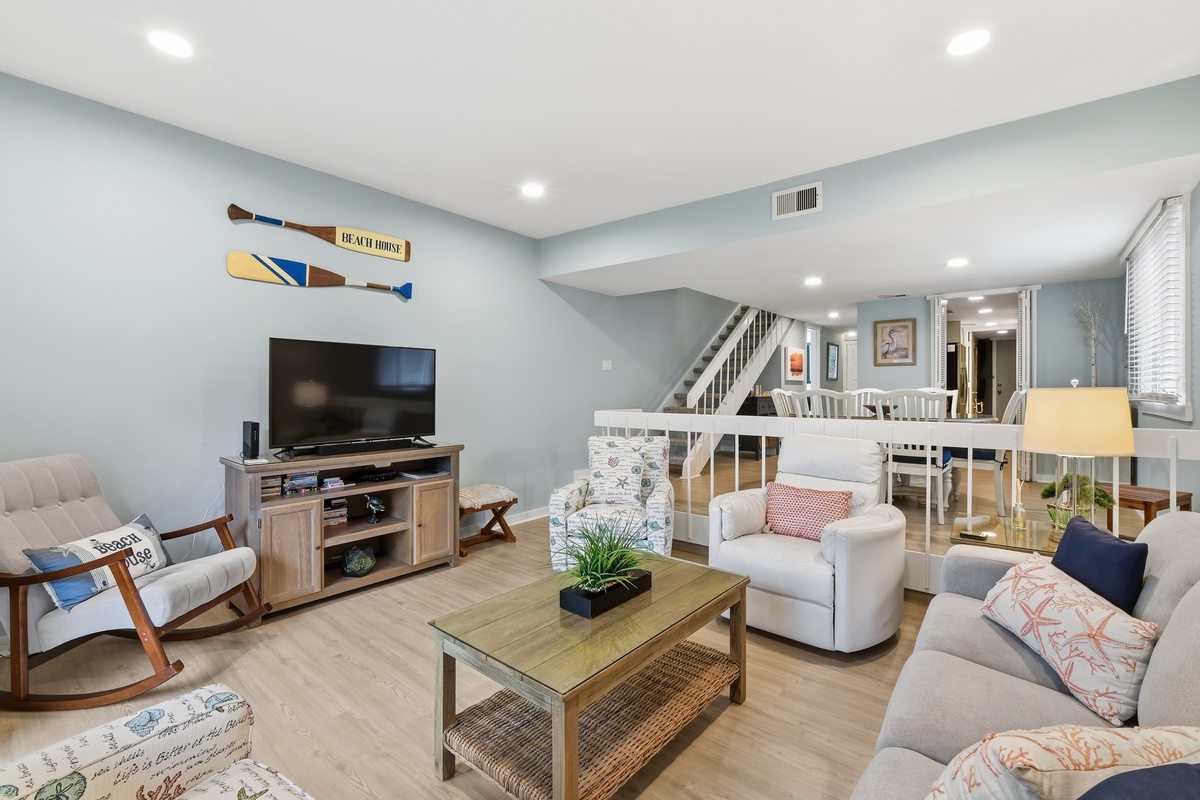 The open living space sees a plush sofa and armchairs set before a flat-screen TV, with dining for six just up a short set of steps. A set of sliding glass doors to one side bathe the room in natural light and give way to a roomy covered patio with bistro table and lushly landscaped views. Off the dining room, a galley-style kitchen sees granite counters surrounding stainless steel appliances for style and convenience of home. A nearby half-bath rounds out the amenities of the main living spaces.