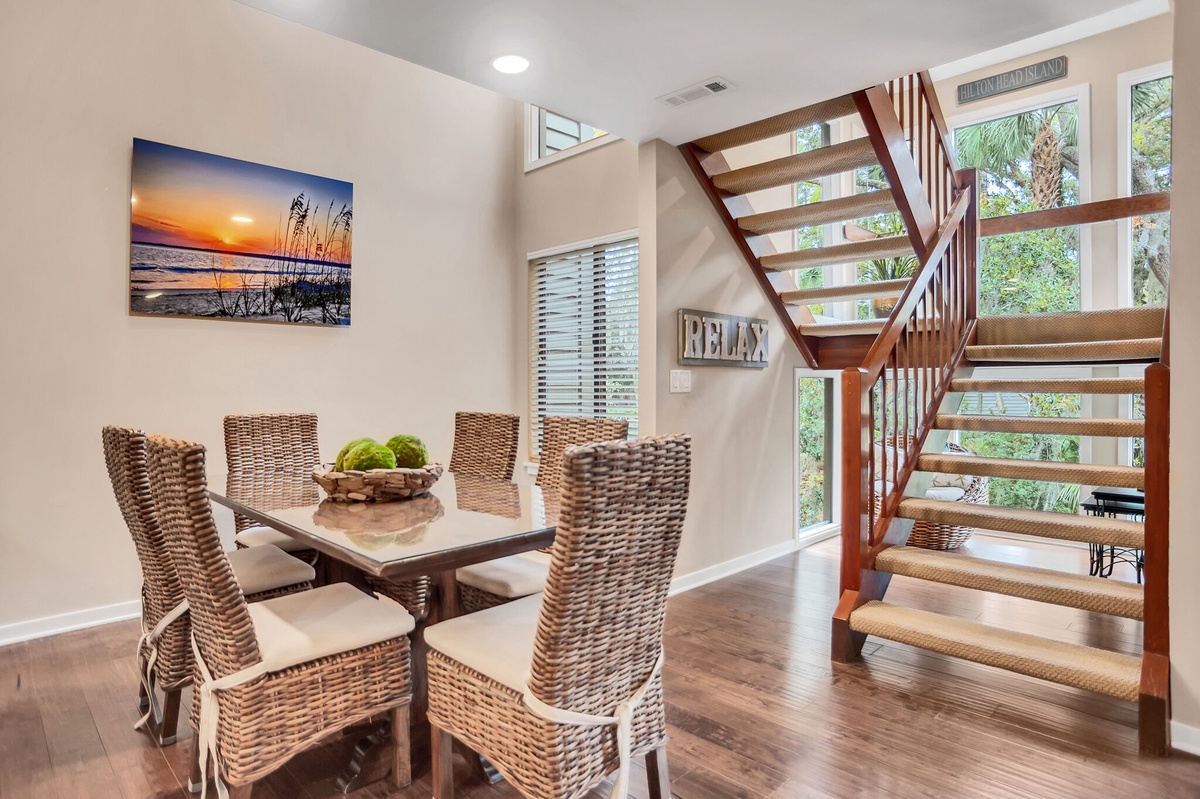 Stairs leading up from the main living space offer a comfortable seating area just below with wraparound windows putting you right out on the water. Just beyond, a dining area benefits immensely from the natural light with a two-story tall ceiling design pouring sunshine on a rustic table with seating for eight and further bar seating for four.
