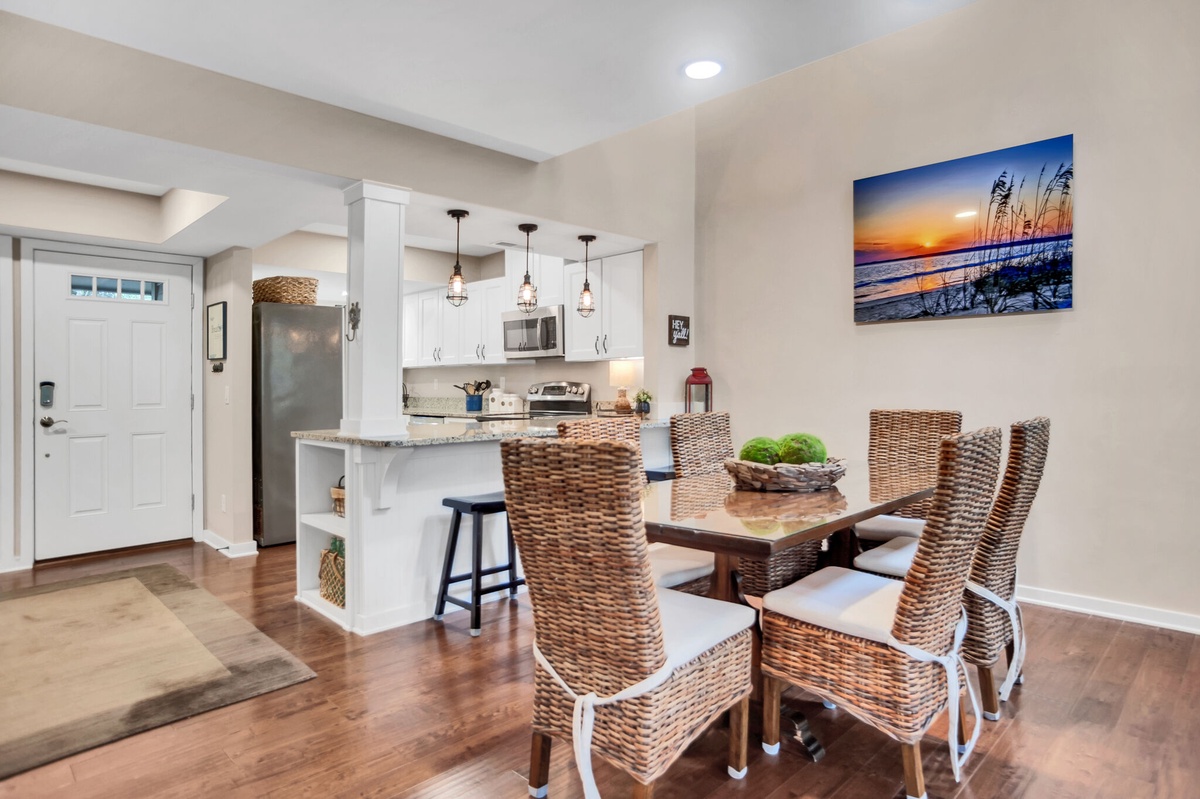 An inviting and architecturally dazzling open floor plan in the main living space takes full advantage of the two-story windows, with hand-scraped hardwood floors running throughout. A conversation area enjoys a granite-topped dry bar beside a roomy queen sized sleeper sofa and nautical-inspired armchairs all situated to enjoy lagoon views. A sliding glass door off of this space leads out to an intriguing back deck with outdoor furniture and gas grill all situated in a space that overhangs the lagoon, providing panoramic water views.