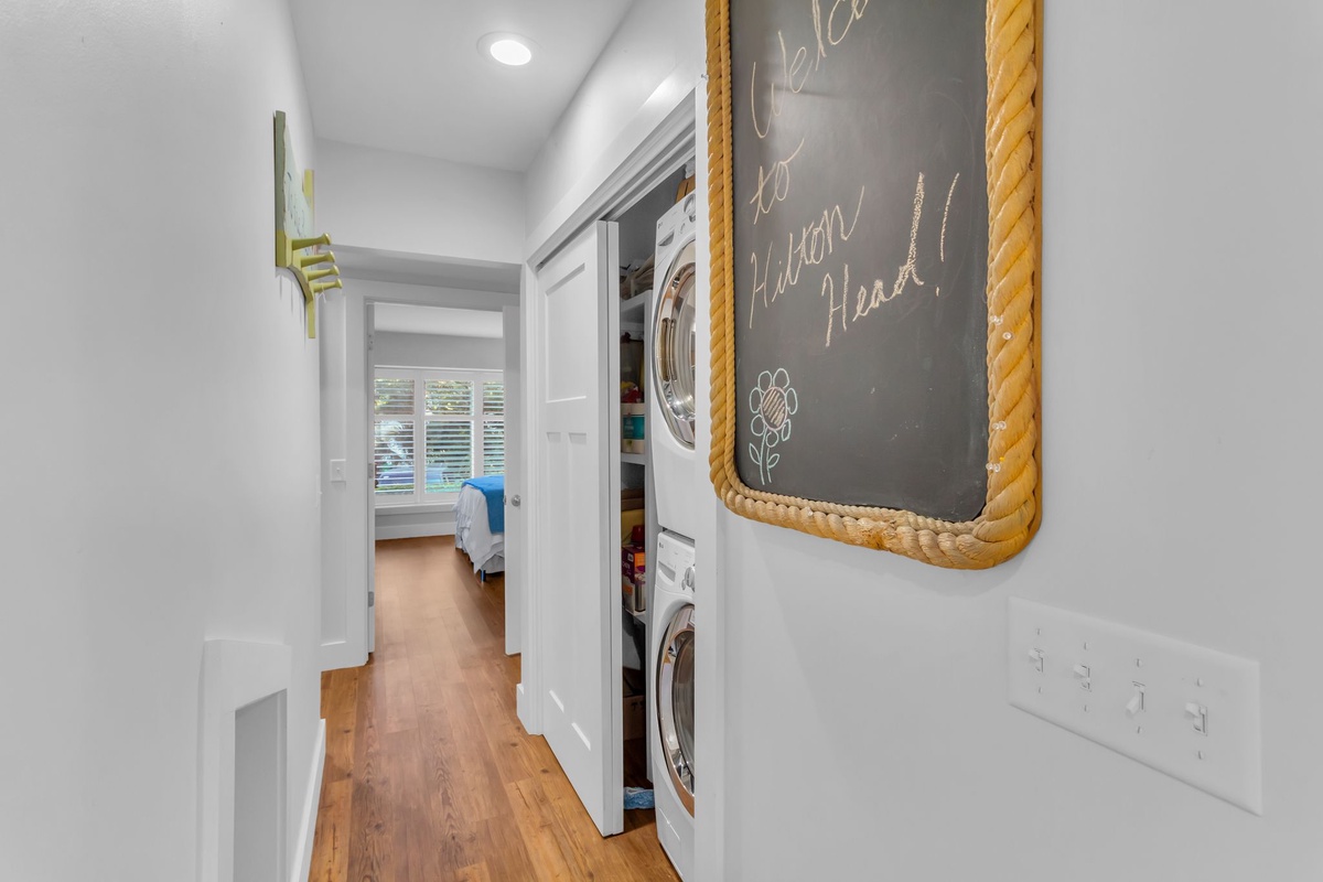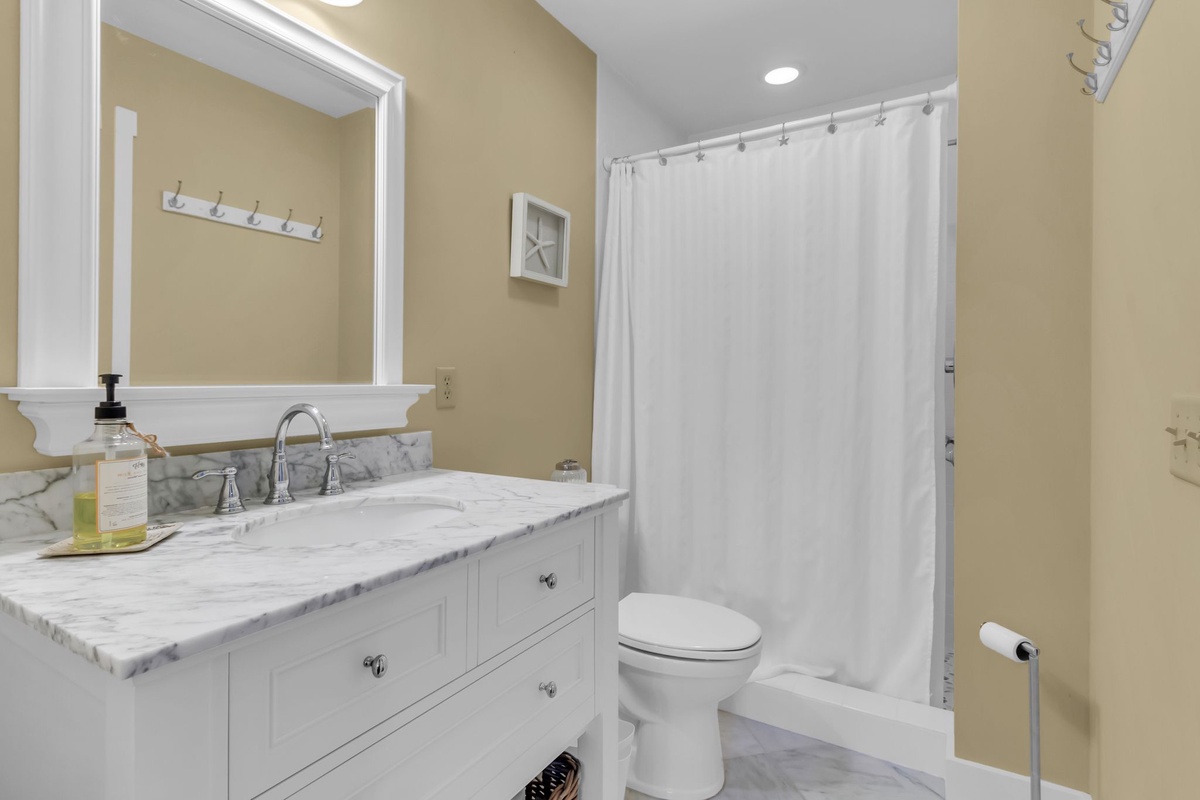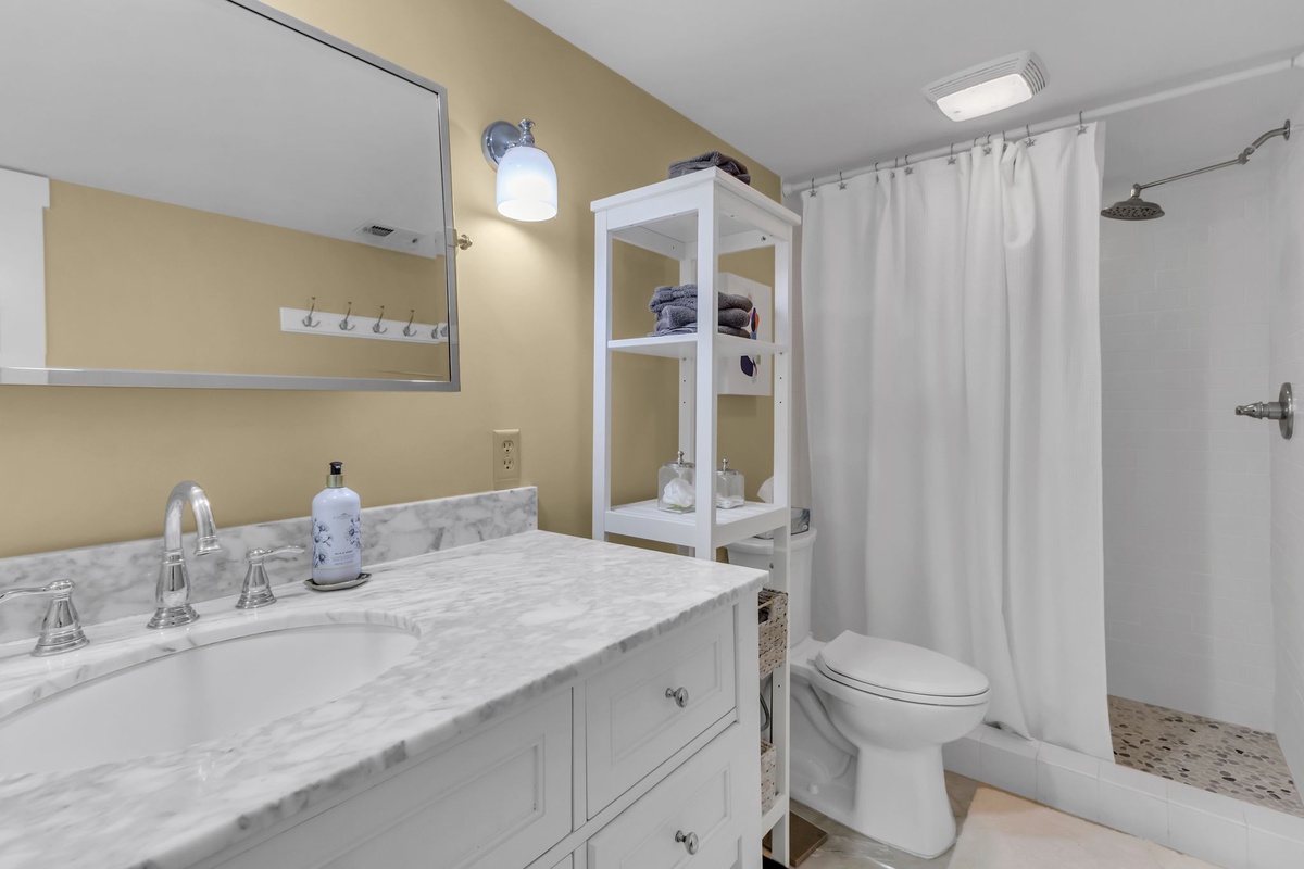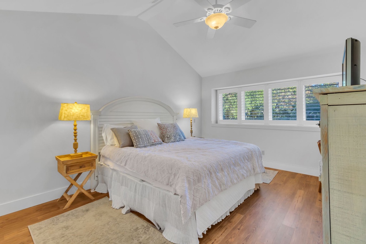 Along with a washer and dryer for the convenience of home, this first floor offers a pair of guest rooms that indulge with comfort. In one, a plush queen size bed is set before a bank of plantation-shuttered windows, with easy access to a full bath with walk-in shower. The second serves as a full suite, set behind French doors from the foyer. Boasting a king-size bed, this space enjoys plantation shuttered windows, ceiling fan, flatscreen TV and ensuite bath with walk-in shower and extended vanity.