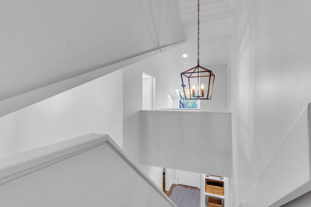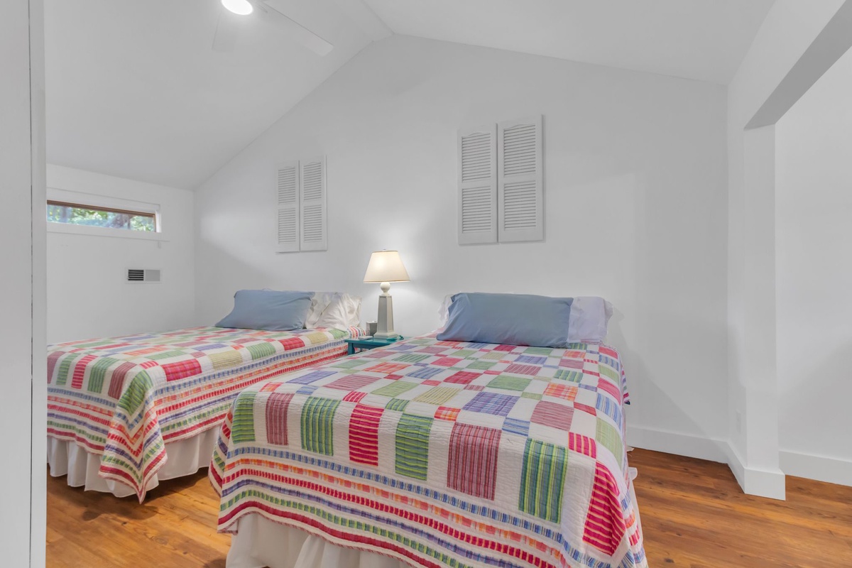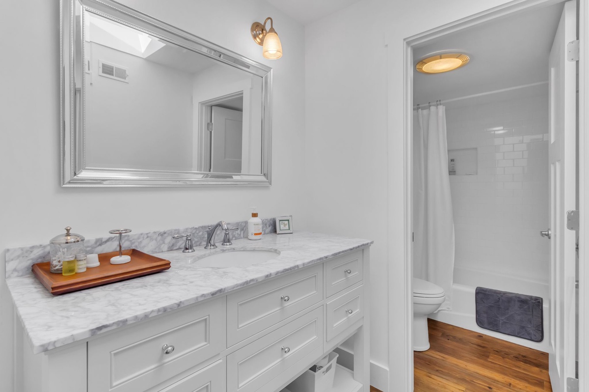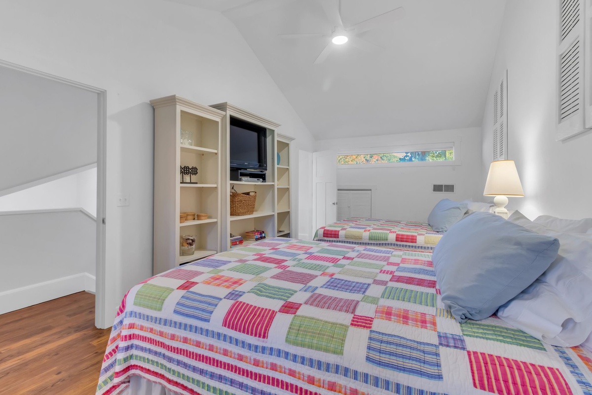 Along with a washer and dryer for the convenience of home, this first floor offers a pair of guest rooms that indulge with comfort. In one, a plush queen size bed is set before a bank of plantation-shuttered windows, with easy access to a full bath with walk-in shower. The second serves as a full suite, set behind French doors from the foyer. Boasting a king-size bed, this space enjoys plantation shuttered windows, ceiling fan, flatscreen TV and ensuite bath with walk-in shower and extended vanity.