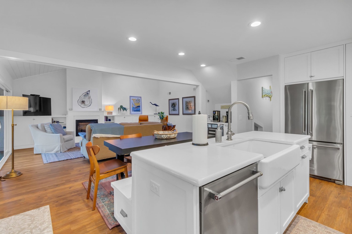 Open to this space is the gourmet kitchen, with its full suite of stainless-steel Kitchen Ade appliances including flat cooktop stove, French door refrigerator, and wine cooler. A center island carries a deep farmhouse sink, transitioning to bench seating at the wide dining table.