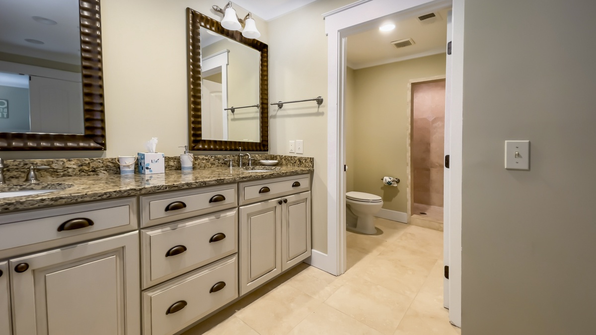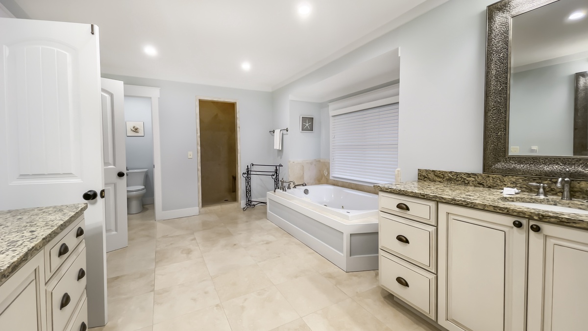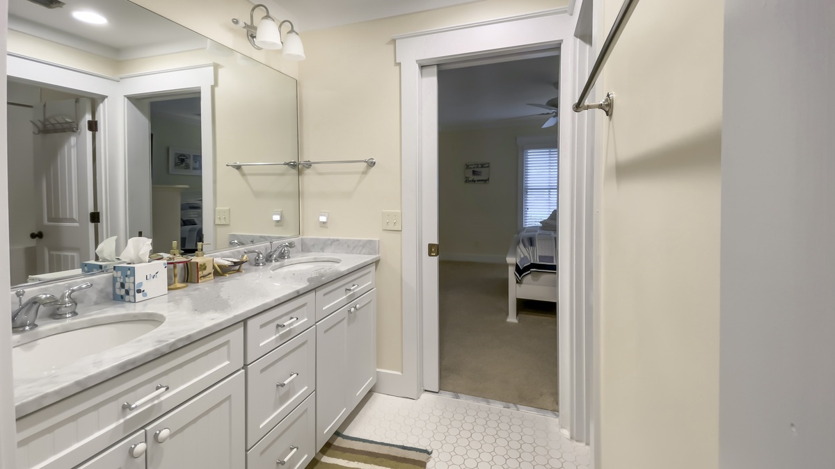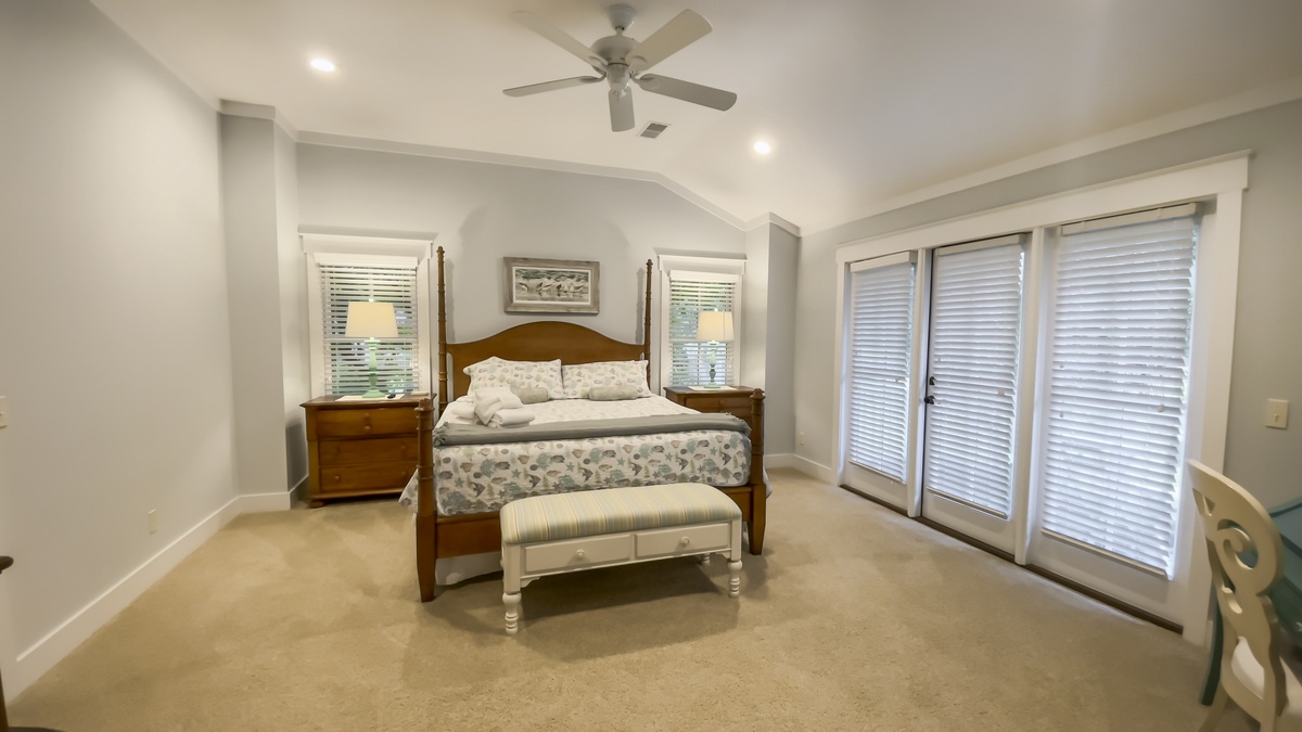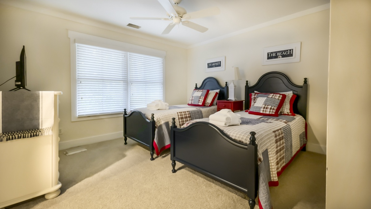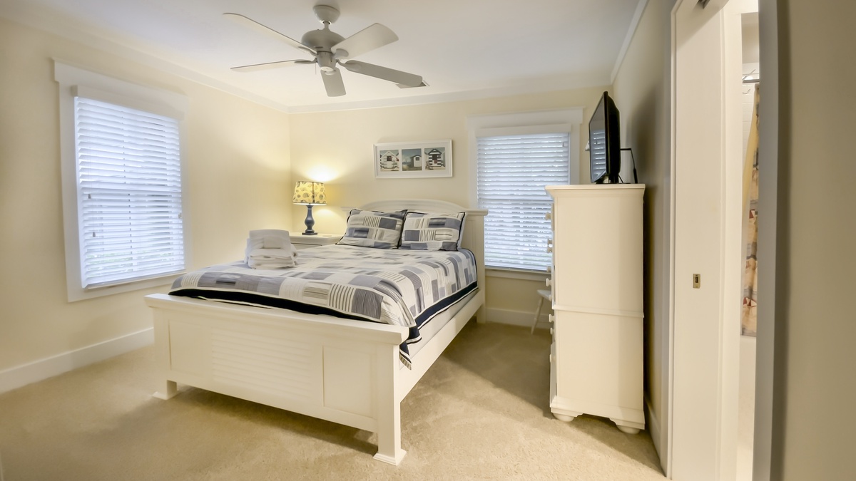There are five guestrooms in total, each carrying the theme of sunlit splendor. Two on the first floor share a jack-and-jill en suite with dual-basin vanity, tub and shower. In one, dual twin beds enjoy a private flat-screen TV and ceiling fan, while the other pairs those same amenities with a queen bed. A third ground floor room boasts a full suite, with queen-size bed, ceiling fan, flat-screen TV and en suite bath with tub and shower.