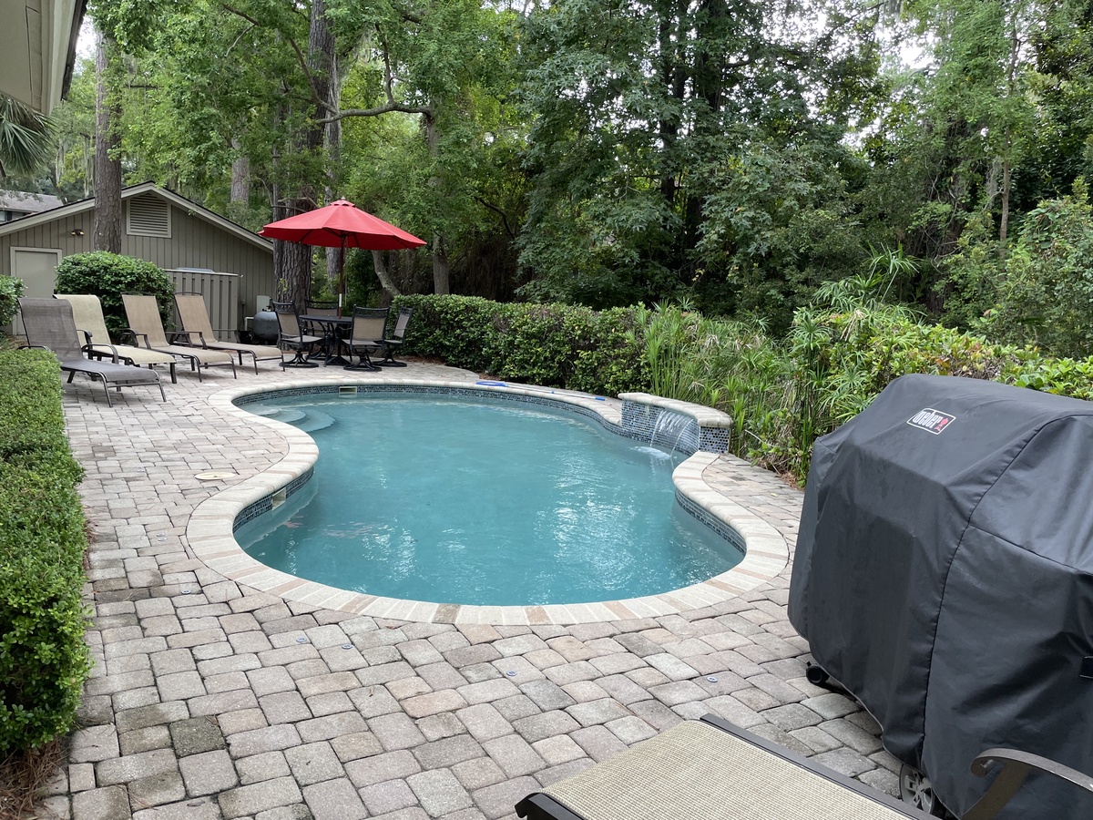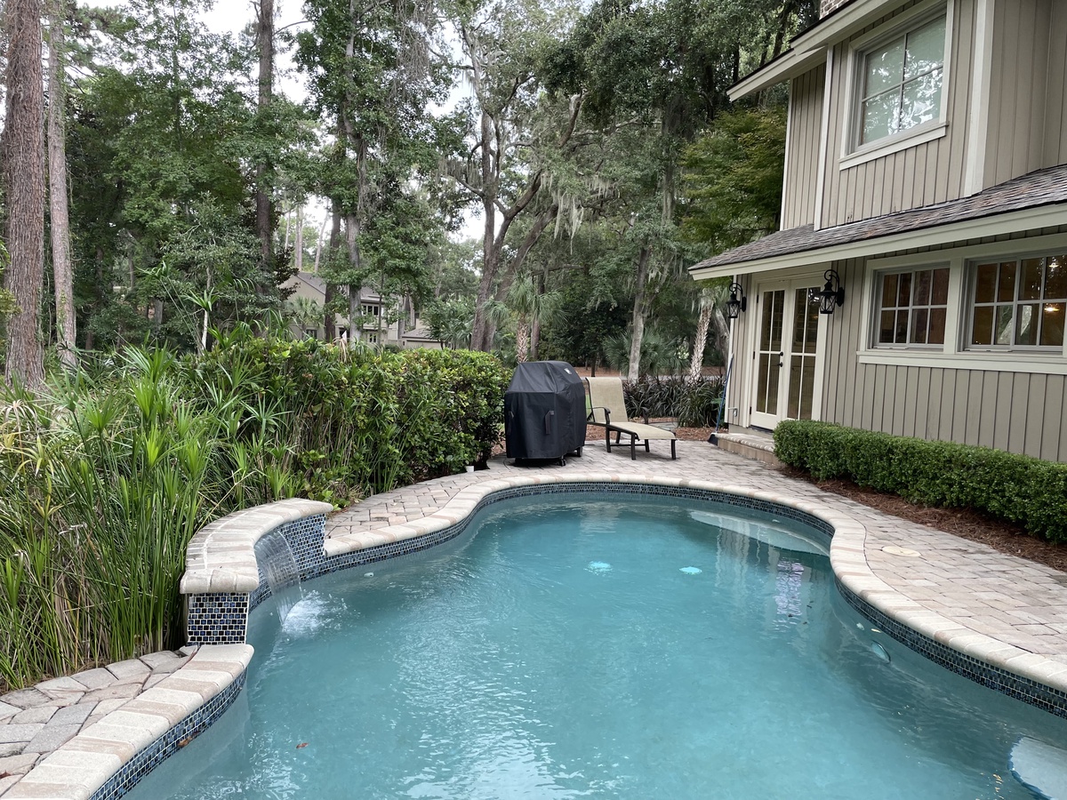 But what sets this amazing property apart is merely hinted out through the bevy of windows and doors that fill these spaces with lush natural light – the majestic outdoor living spaces. Wrapping around the home and offering breathtaking views of the 5th hole at Harbour Town Golf Links, these spaces provide opportunity for quiet reflection, late-night conversations and all-day enjoyment. Enjoy the crackling flames of a full fire table on one patio, or the rustic fire pit beneath the boughs of a mature Japanese maple. Or spend the day in sun-soaked splendor on the brick-paver pool deck, ringed by greenery for privacy and filled with the tranquil splashing from the water feature.