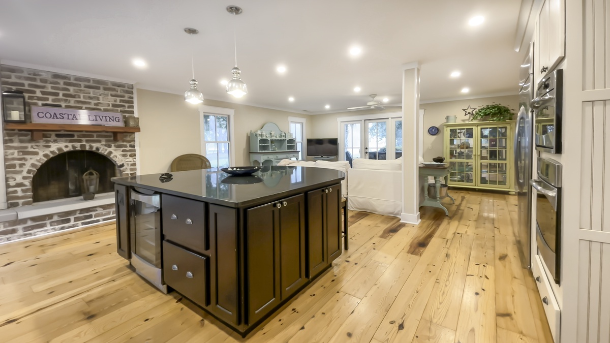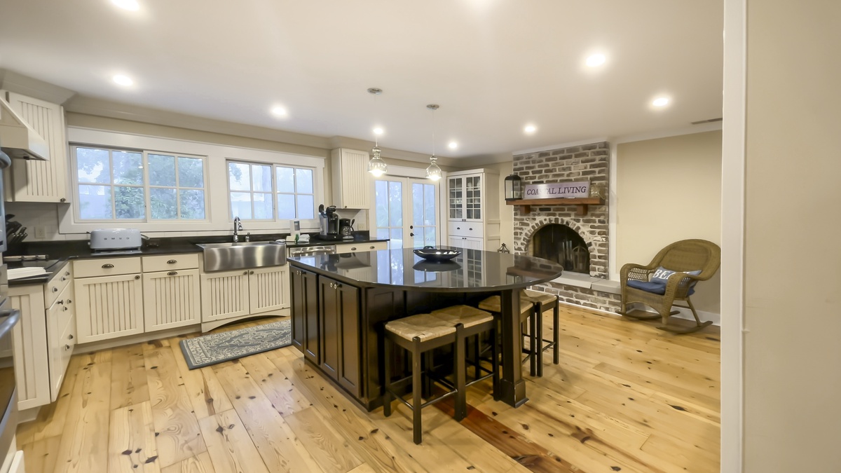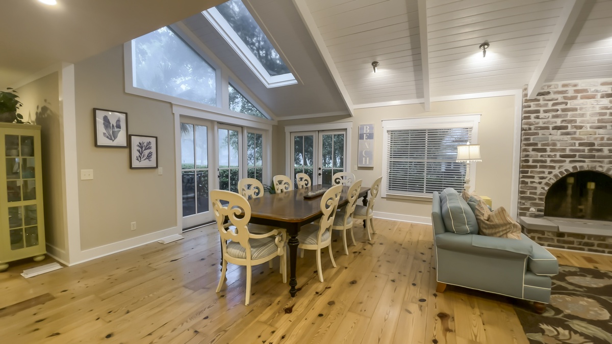 Wide pine flooring beckons your inward, drawing your eye immediately to the lush sunlit openness of the great room. Here a wide skylight set in an exposed-beam vaulted ceiling illuminates a space with a Savannah brick decorative fireplace adding a homey feel to a space with sofa, loveseat and flat-screen TV. This same expanse houses the dining room, where a farmhouse-style table is set for 8, but could easily seat more.