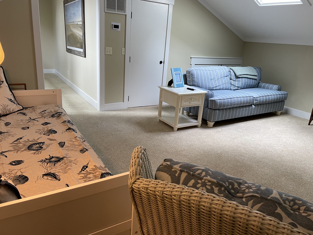 Set in lush carpeting, the final guest suite can be accessed through an expansive den with vaulted ceilings set with skylight, plush sofa, twin bed with trundle and flat-screen TV. The suite beyond boasts a carriage house feel, with vaulted ceilings, king-size bed, and flat screen TV concealed in an armoire. One set of doors gives way to a breathtaking balcony offering elevated golf views. The other, to a spa-like en suite with his and hers vanities, soaking tub with jets, and expansive walk-in shower.
