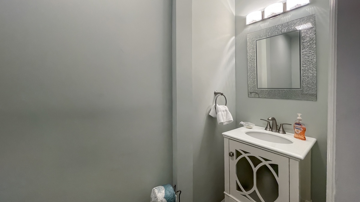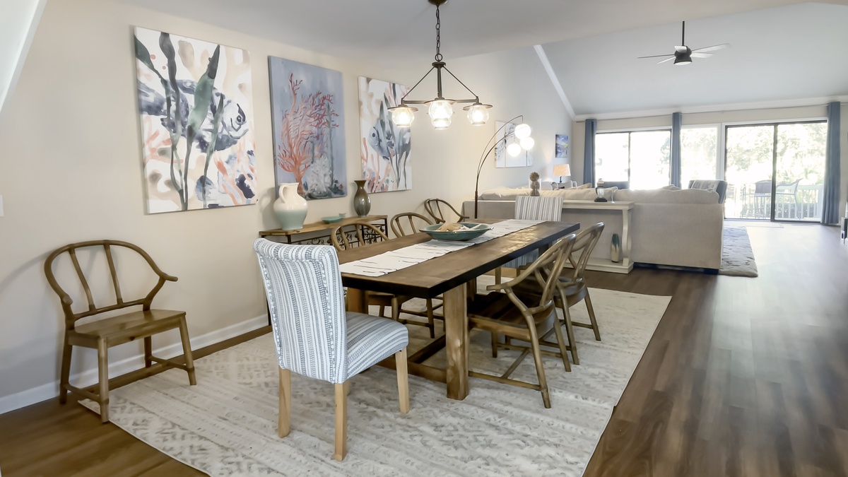 Set beneath an expansive loft, the dining room offers seating for eight amid refined Lowcountry style. And for entertaining, the sprawling kitchen boasts a bevy of stainless-steel appliances surrounded by wraparound granite counters. Rounding out the amenities in this blissful vacation villa are a spacious powder room and full washer and dryer. Set above the main living space a staircase takes you under an expansive skylight to a second living space complete with sleeper sofa and TV leading to the third bedroom (queen size) and third bathroom with tub and shower.