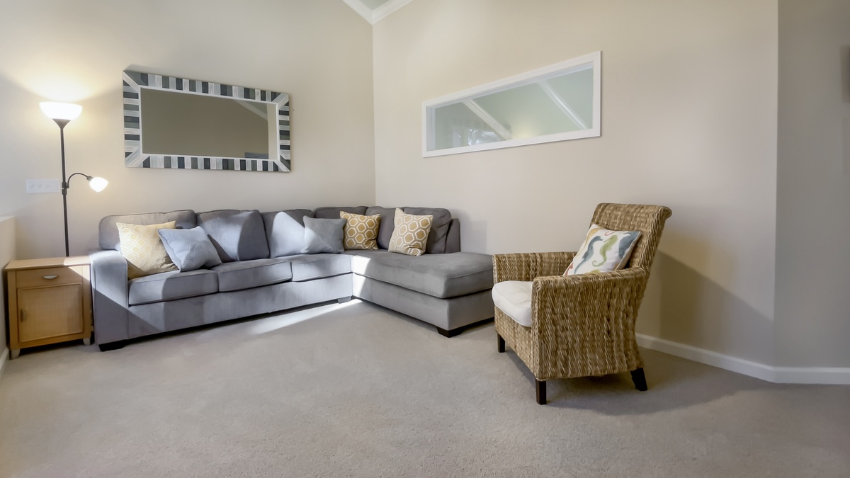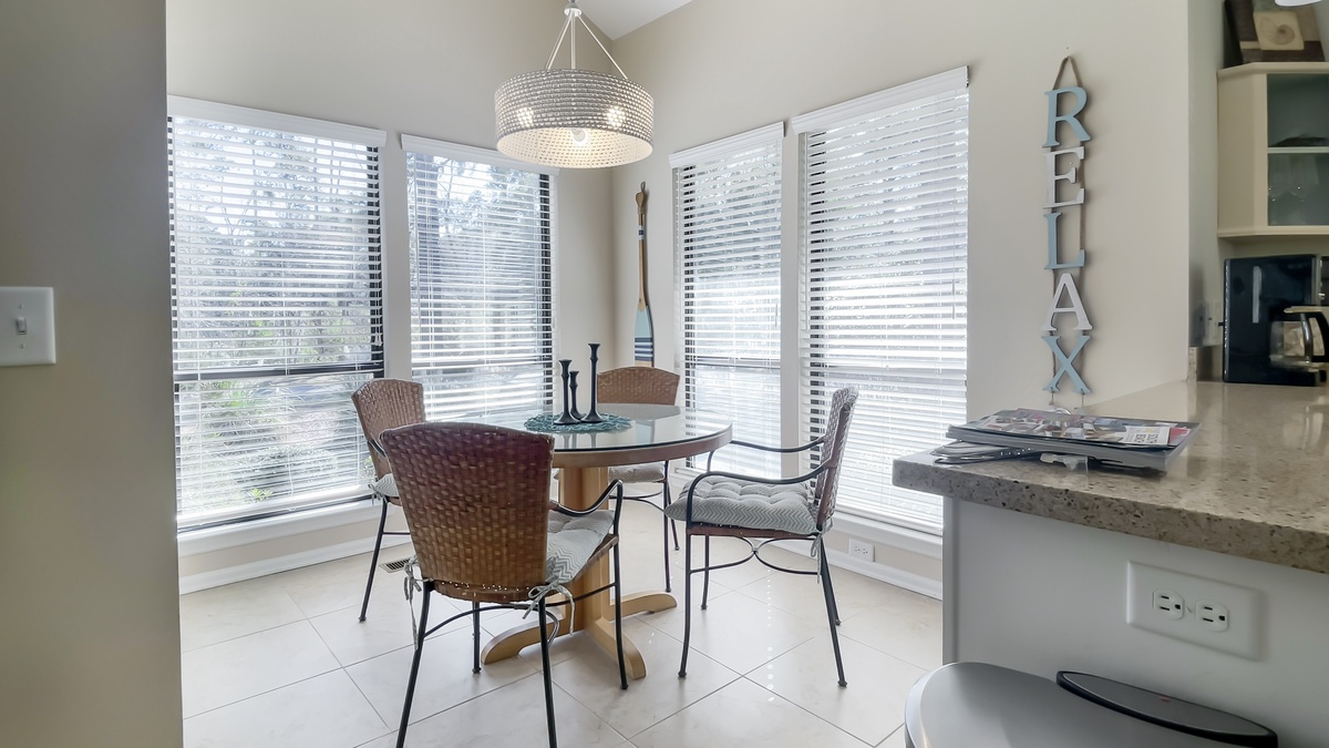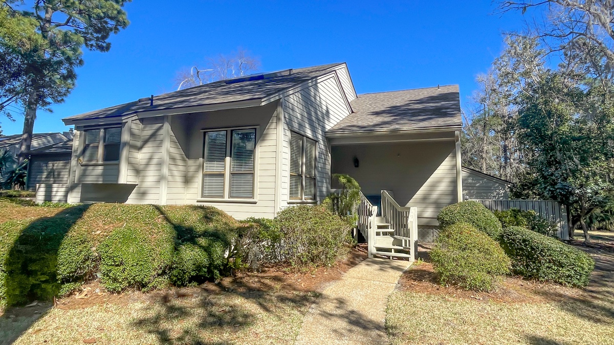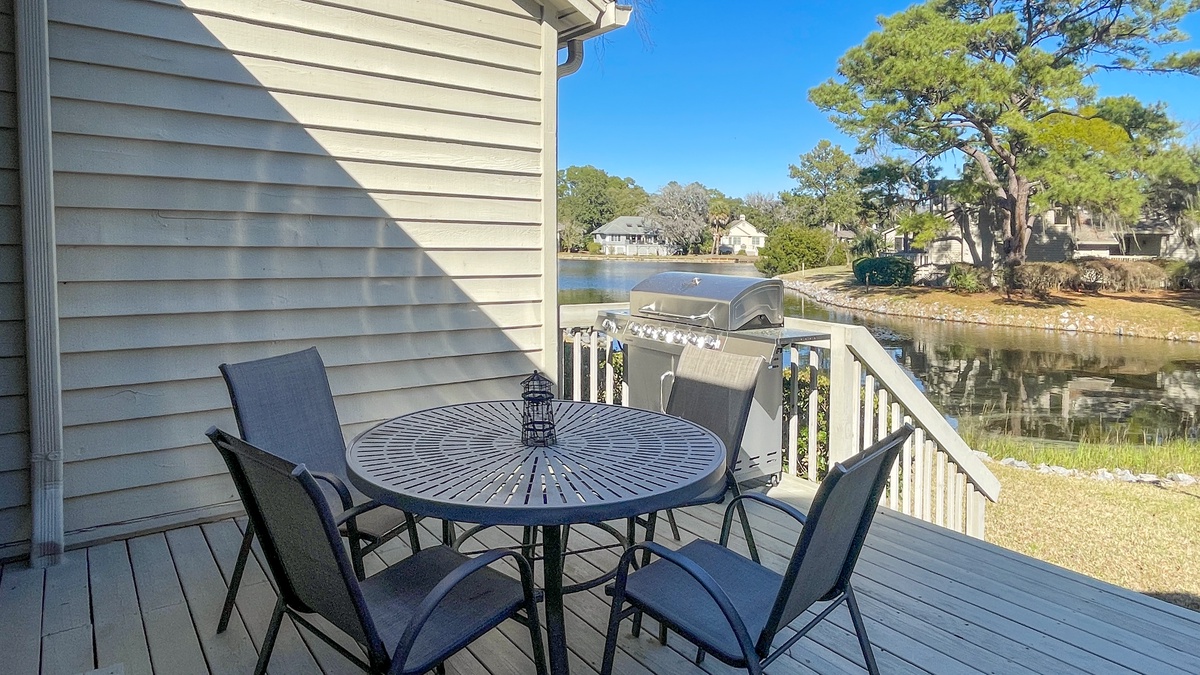 The villa sits across from the swimming pool and tennis courts offering an opportunity to a refreshing swim or opportunity to play. Another option is to sit on the back deck of the villa overlooking a lagoon with wildlife and sunrises or shade from the late afternoon sun. The deck offers outdoor sitting and dining as well as a gas grill.